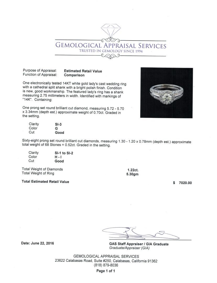 One electronically tested 14KT white gold lady's cast wedding ring with a cathedral split shank with a bright polish finish. The featured lady's ring has a shank measuring 2.75 millimeters in width. Identified with markings of "14K". Condition is new, good workmanship. Containing: One prong set round brilliant cut diamond, measuring 5.72 - 5.70 x 3.34mm (depth est.) approximate weight of 0.70ct. Graded in the setting. Clarity: SI-3. Color: Good Sixty-Eight prong set round brilliant cut diamonds, measuring 1.30 - 1.20 x 0.78mm (depth est.) approximate total weight of 68 Stones = 0.52ct. Graded in the setting. Clarity: SI-1 to SI-2. Color: H - I. Cut Good. Total Weight of Diamonds 1.22ct. Total Weight of Ring 5.30gm. GAS Appraised at $7,020.00.