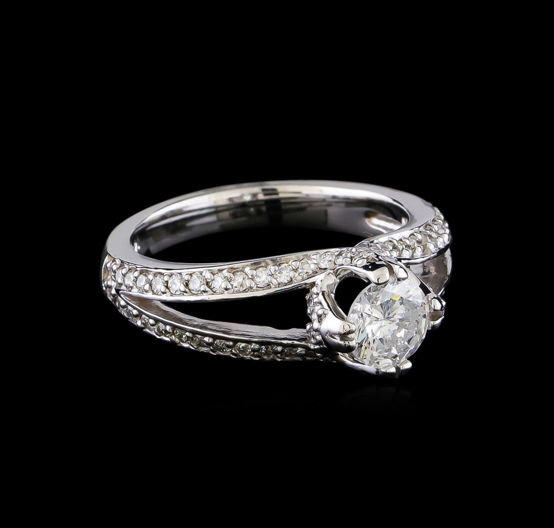 One electronically tested 14KT white gold lady's cast wedding ring with a cathedral split shank with a bright polish finish. The featured lady's ring has a shank measuring 2.75 millimeters in width. Identified with markings of "14K". Condition is new, good workmanship. Containing: One prong set round brilliant cut diamond, measuring 5.72 - 5.70 x 3.34mm (depth est.) approximate weight of 0.70ct. Graded in the setting. Clarity: SI-3. Color: Good Sixty-Eight prong set round brilliant cut diamonds, measuring 1.30 - 1.20 x 0.78mm (depth est.) approximate total weight of 68 Stones = 0.52ct. Graded in the setting. Clarity: SI-1 to SI-2. Color: H - I. Cut Good. Total Weight of Diamonds 1.22ct. Total Weight of Ring 5.30gm. GAS Appraised at $7,020.00.