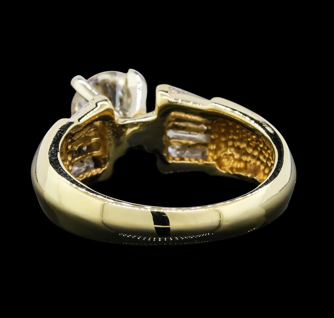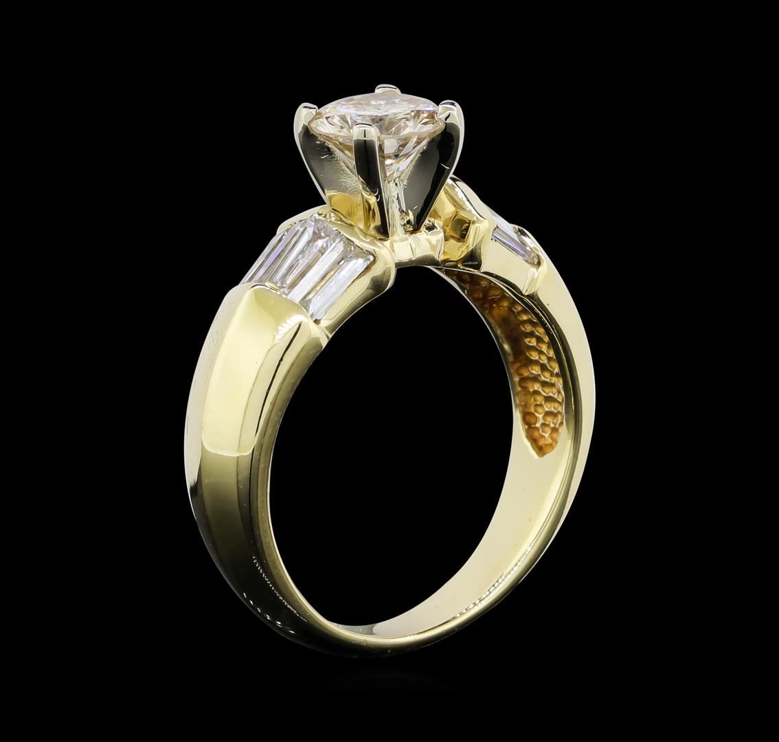 One electronically tested 14KT yellow gold lady's cast wedding ring with a knife edge cathedral shank with a bright polish finish. The featured lady's ring has a shank measuring 3.00 millimeters wide. Identified with markings of '14K'. Condition is new, good workmanship. Containing: One prong set round brilliant cut diamond, measuring 5.73 - 5.70 x 3.43mm (depth est.) approximate weight of 0.67ct. Graded in the setting. Clarity I-1. Color: J - K Cut Good Eight channel set baguette cut (tapered) diamonds, measuring from 3.60 x 1.50 x 1.28mm (depth est.) to 3.80 x 1.60 x 1.36mm (depth est.) approximate total weight of 8 Stones = 0.55ct. Graded in the setting. Clarity VS-1 to VS-2. Color: G - H Cut Good. Total Weight of Diamonds 1.22ct.. Total Weight of Ring 4.50gm. GAS Appraised at $5,465.00.