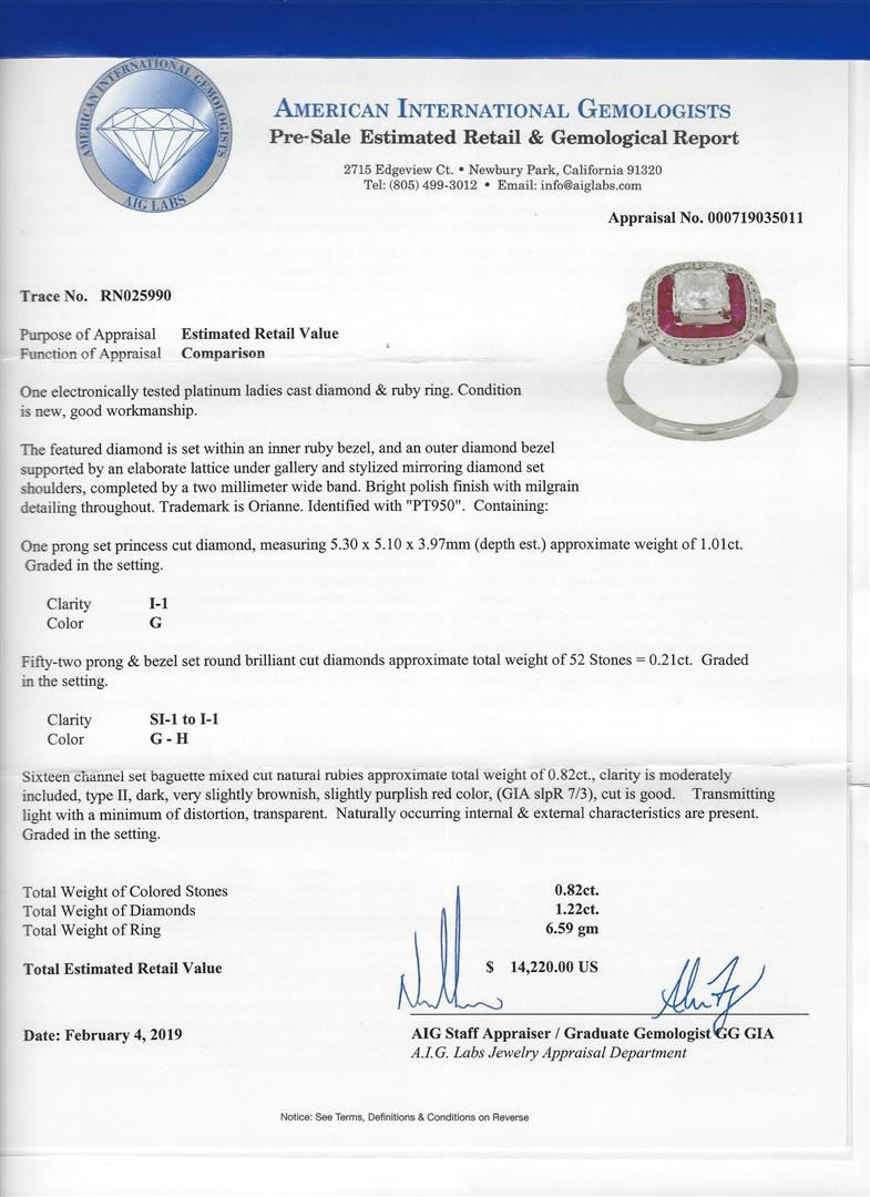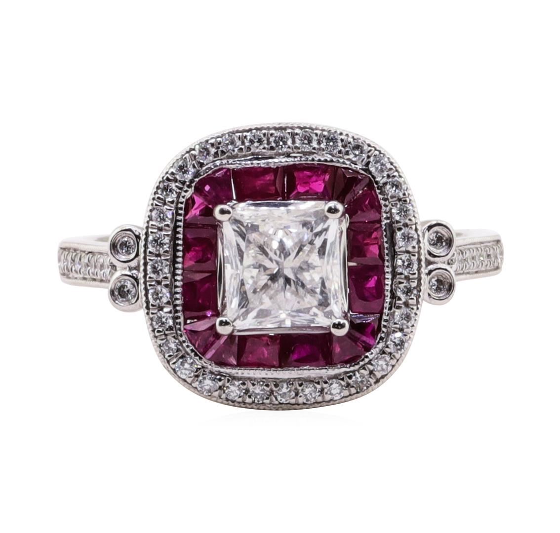 One 1.22ctw Diamond and Ruby Ring - Platinum. AIG certified. See Appraisal for more details. AIG Appraised.