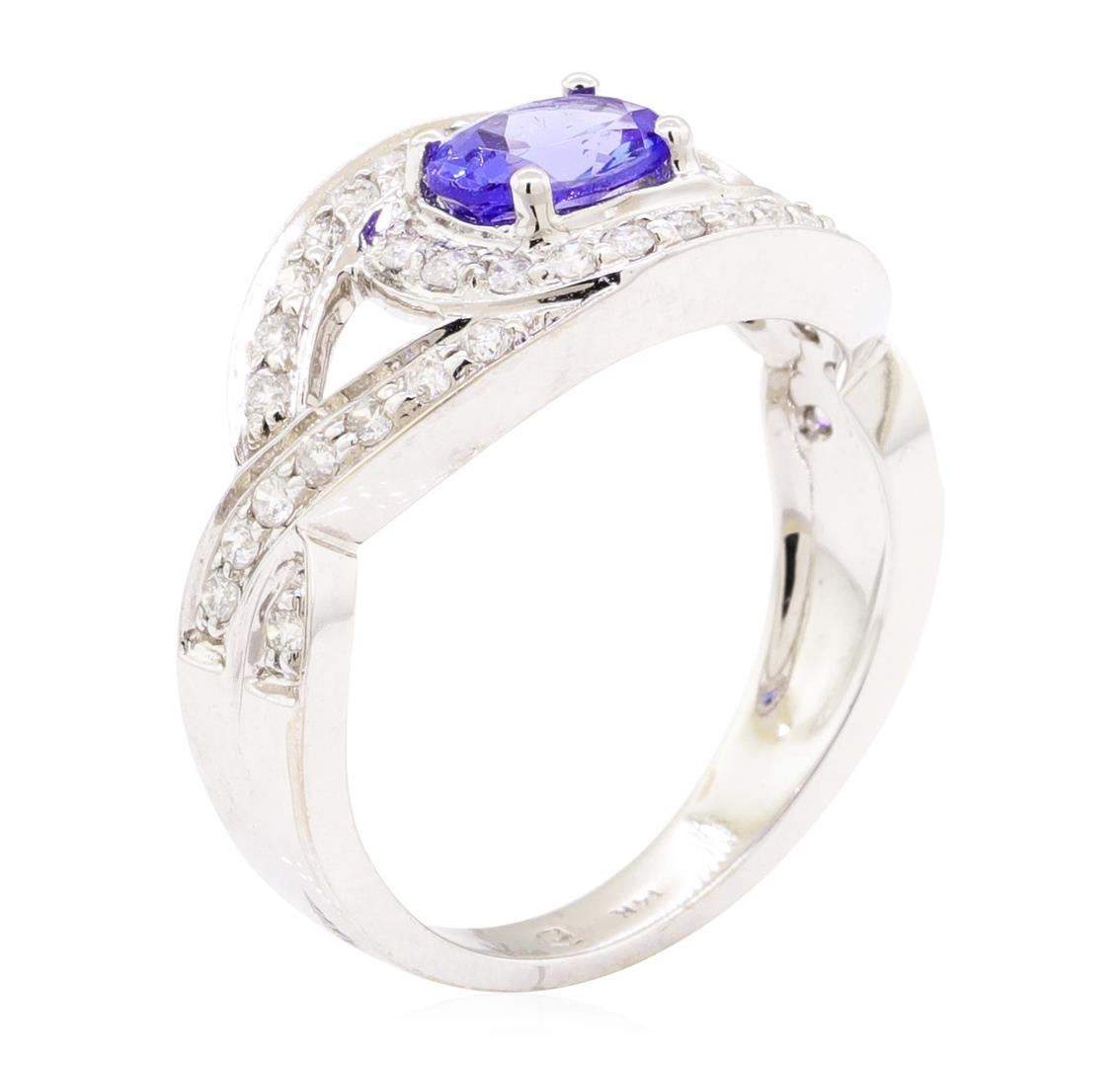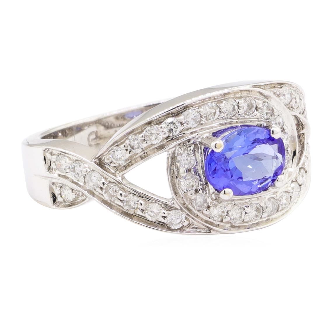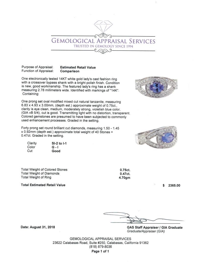 One electronically tested 14KT white gold lady's cast fashion ring with a crossover bypass shank with a bright polish finish. The featured lady's ring has a shank measuring 2.78 millimeters wide. Identified with markings of '14K'. Condition is new, good workmanship. Containing: One prong set oval modified mixed cut natural tanzanite, measuring 6.83 x 4.93 x 3.00mm, (depth est.) approximate weight of 0.75ct., clarity is eye clean, medium, moderately strong, violetish blue color, (GIA vB 5/4), cut is good. Transmitting light with no distortion, transparent. Colored gemstones are presumed to have been subjected to commonly used enhancement processes. Graded in the setting. Forty prong set round brilliant cut diamonds, measuring 1.50 - 1.45 x 0.92mm (depth est.) approximate total weight of 40 Stones = 0.47ct. Graded in the setting. Color G - I Clarity SI-2 to I-1 Cut Good. Total Weight of Colored Stones 0.75ct.. Total Weight of Diamonds 0.47ct.. Total Weight of Ring 4.70gm GAS Appraised at $2365.00. GAS Appraised at $2,365.00.