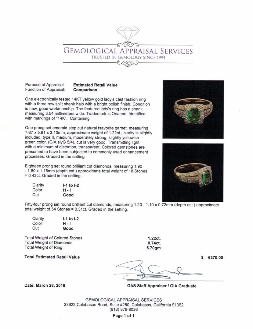 One electronically tested 14KT yellow gold lady's cast fashion ring with a three row split shank halo with a bright polish finish. The featured lady's ring has a shank measuring 3.54 millimeters wide. Trademark is Orianne. Identified with markings of "14K". Condition is new, good workmanship. Containing: One prong set emerald step cut natural tsavorite garnet, measuring 7.67 x 5.81 x 3.10mm, approximate weight of 1.22ct., clarity is slightly included, type II, medium, moderately strong, slightly yellowish green color, (GIA slyG 5/4), cut is very good. Transmitting light with a minimum of distortion, transparent. Colored gemstones are presumed to have been subjected to commonly used enhancement processes. Graded in the setting. Eighteen prong set round brilliant cut diamonds, measuring 1.90 - 1.80 x 1.15mm (depth est.) approximate total weight of 18 Stones = 0.43ct. Graded in the setting. Clarity: I-1 to I-2. Color: H - I. Cut Good Fifty-Four prong set round brilliant cut diamonds, measuring 1.20 - 1.10 x 0.72mm (depth est.) approximate total weight of 54 Stones = 0.31ct. Graded in the setting. Clarity: I-1 to I-2. Color: H - I. Cut Good. Total Weight of Colored Stones 1.22ct. Total Weight of Diamonds 0.74ct. Total Weight of Ring 6.70gm. GAS Appraised at $6,370.00.