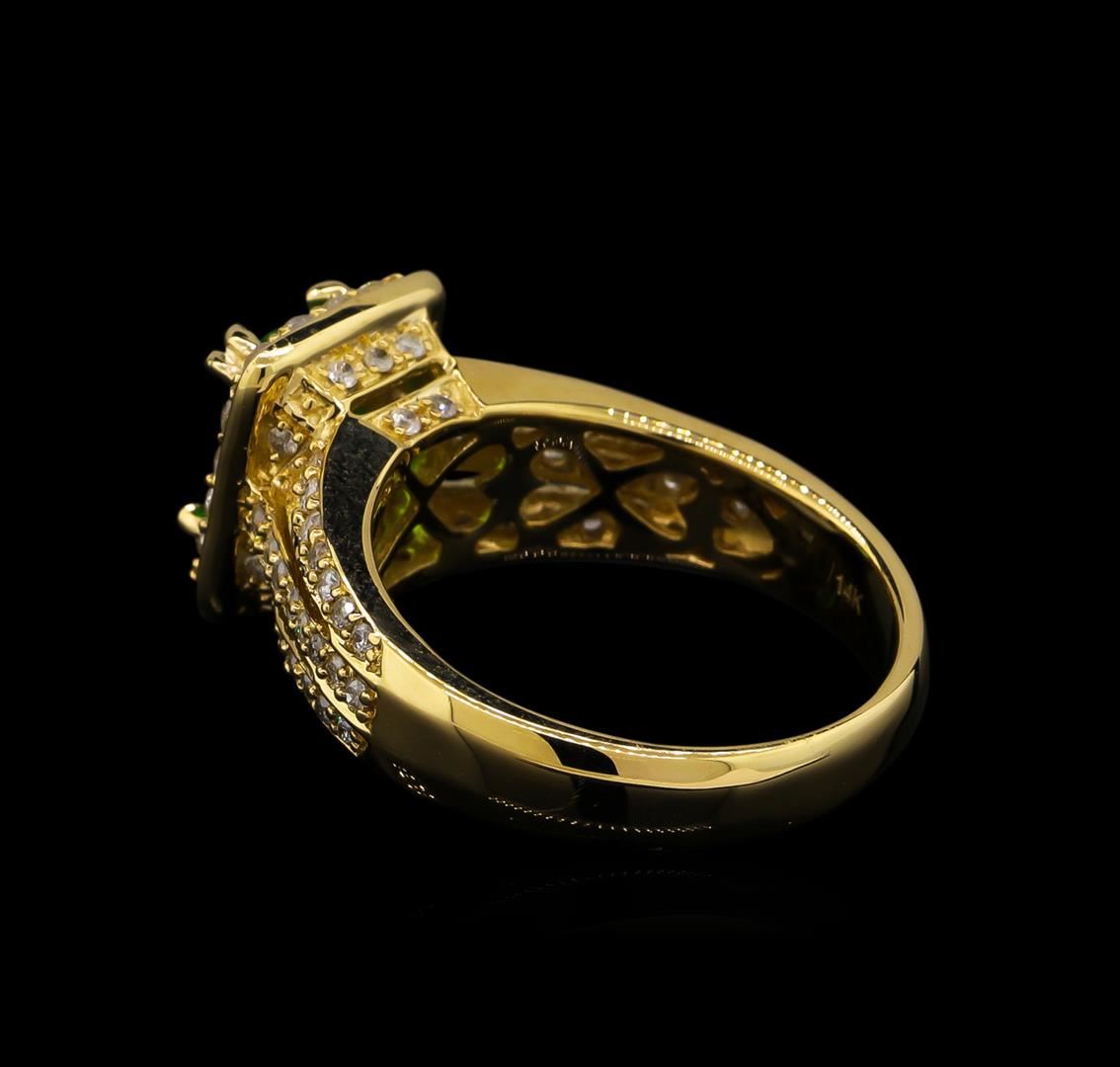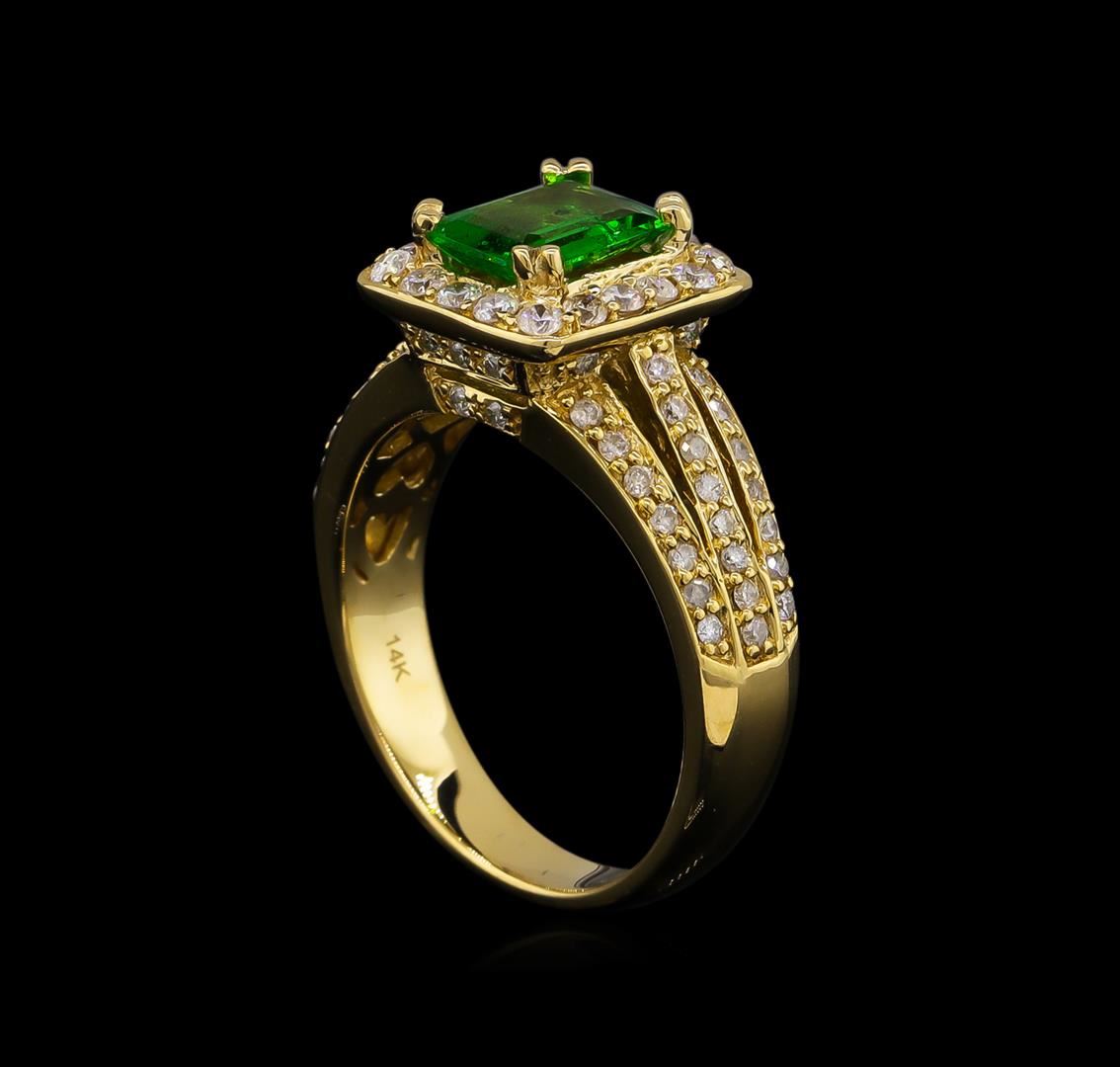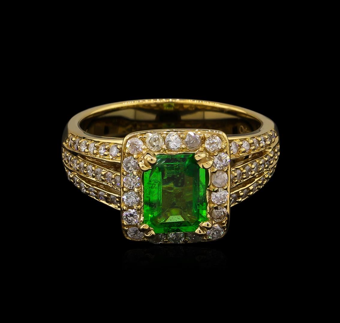 One electronically tested 14KT yellow gold lady's cast fashion ring with a three row split shank halo with a bright polish finish. The featured lady's ring has a shank measuring 3.54 millimeters wide. Trademark is Orianne. Identified with markings of "14K". Condition is new, good workmanship. Containing: One prong set emerald step cut natural tsavorite garnet, measuring 7.67 x 5.81 x 3.10mm, approximate weight of 1.22ct., clarity is slightly included, type II, medium, moderately strong, slightly yellowish green color, (GIA slyG 5/4), cut is very good. Transmitting light with a minimum of distortion, transparent. Colored gemstones are presumed to have been subjected to commonly used enhancement processes. Graded in the setting. Eighteen prong set round brilliant cut diamonds, measuring 1.90 - 1.80 x 1.15mm (depth est.) approximate total weight of 18 Stones = 0.43ct. Graded in the setting. Clarity: I-1 to I-2. Color: H - I. Cut Good Fifty-Four prong set round brilliant cut diamonds, measuring 1.20 - 1.10 x 0.72mm (depth est.) approximate total weight of 54 Stones = 0.31ct. Graded in the setting. Clarity: I-1 to I-2. Color: H - I. Cut Good. Total Weight of Colored Stones 1.22ct. Total Weight of Diamonds 0.74ct. Total Weight of Ring 6.70gm. GAS Appraised at $6,370.00.