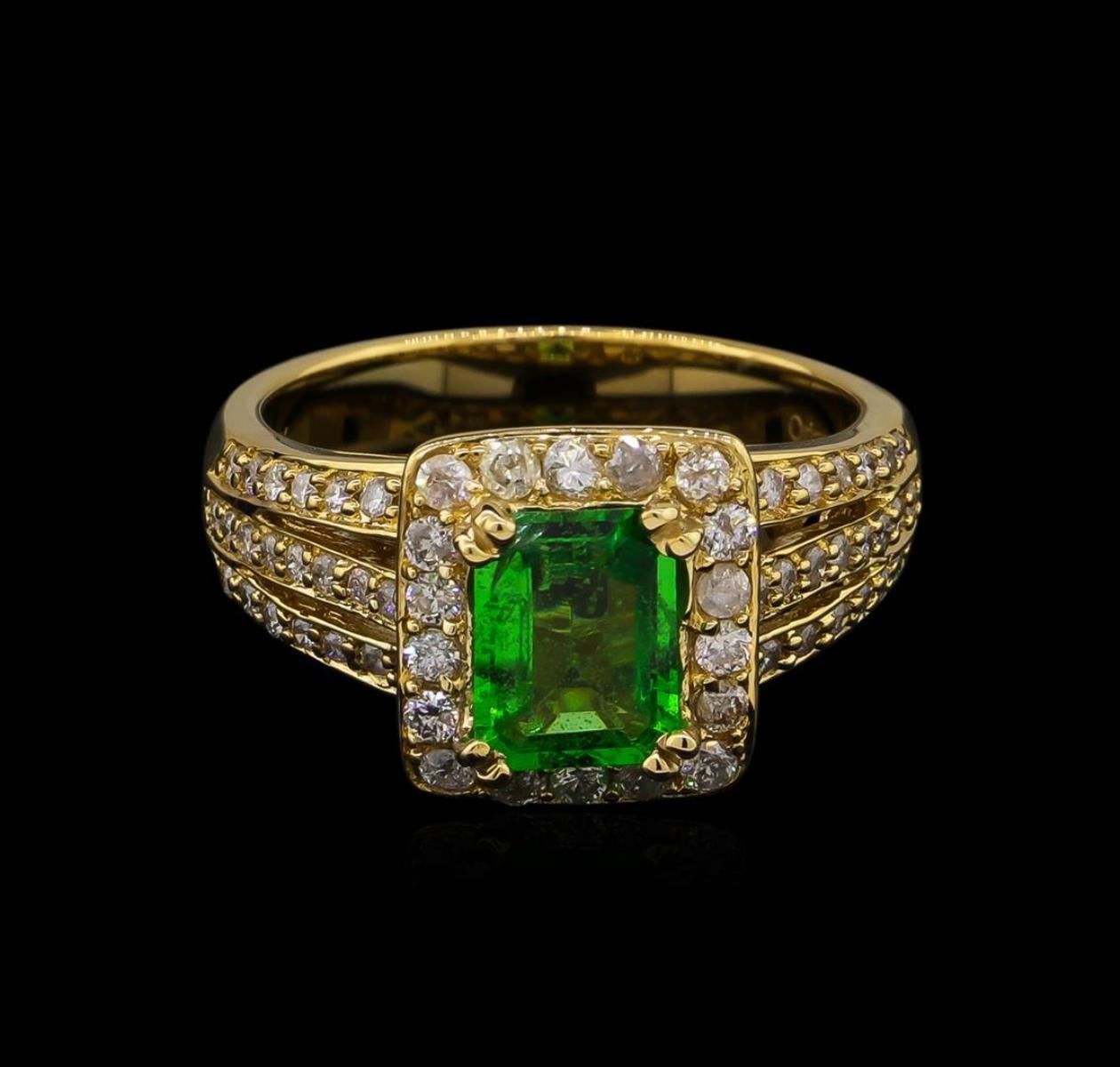 One electronically tested 14KT yellow gold lady's cast fashion ring with a three row split shank halo with a bright polish finish. The featured lady's ring has a shank measuring 3.54 millimeters wide. Trademark is Orianne. Identified with markings of "14K". Condition is new, good workmanship. Containing: One prong set emerald step cut natural tsavorite garnet, measuring 7.67 x 5.81 x 3.10mm, approximate weight of 1.22ct., clarity is slightly included, type II, medium, moderately strong, slightly yellowish green color, (GIA slyG 5/4), cut is very good. Transmitting light with a minimum of distortion, transparent. Colored gemstones are presumed to have been subjected to commonly used enhancement processes. Graded in the setting. Eighteen prong set round brilliant cut diamonds, measuring 1.90 - 1.80 x 1.15mm (depth est.) approximate total weight of 18 Stones = 0.43ct. Graded in the setting. Clarity: I-1 to I-2. Color: H - I. Cut Good Fifty-Four prong set round brilliant cut diamonds, measuring 1.20 - 1.10 x 0.72mm (depth est.) approximate total weight of 54 Stones = 0.31ct. Graded in the setting. Clarity: I-1 to I-2. Color: H - I. Cut Good. Total Weight of Colored Stones 1.22ct. Total Weight of Diamonds 0.74ct. Total Weight of Ring 6.70gm. GAS Appraised.