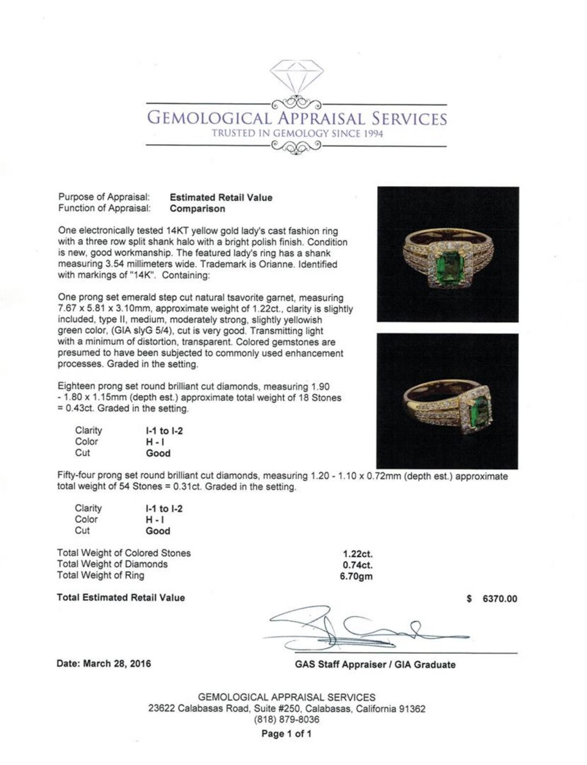 One electronically tested 14KT yellow gold lady's cast fashion ring with a three row split shank halo with a bright polish finish. The featured lady's ring has a shank measuring 3.54 millimeters wide. Trademark is Orianne. Identified with markings of "14K". Condition is new, good workmanship. Containing: One prong set emerald step cut natural tsavorite garnet, measuring 7.67 x 5.81 x 3.10mm, approximate weight of 1.22ct., clarity is slightly included, type II, medium, moderately strong, slightly yellowish green color, (GIA slyG 5/4), cut is very good. Transmitting light with a minimum of distortion, transparent. Colored gemstones are presumed to have been subjected to commonly used enhancement processes. Graded in the setting. Eighteen prong set round brilliant cut diamonds, measuring 1.90 - 1.80 x 1.15mm (depth est.) approximate total weight of 18 Stones = 0.43ct. Graded in the setting. Clarity: I-1 to I-2. Color: H - I. Cut Good Fifty-Four prong set round brilliant cut diamonds, measuring 1.20 - 1.10 x 0.72mm (depth est.) approximate total weight of 54 Stones = 0.31ct. Graded in the setting. Clarity: I-1 to I-2. Color: H - I. Cut Good. Total Weight of Colored Stones 1.22ct. Total Weight of Diamonds 0.74ct. Total Weight of Ring 6.70gm. GAS Appraised.