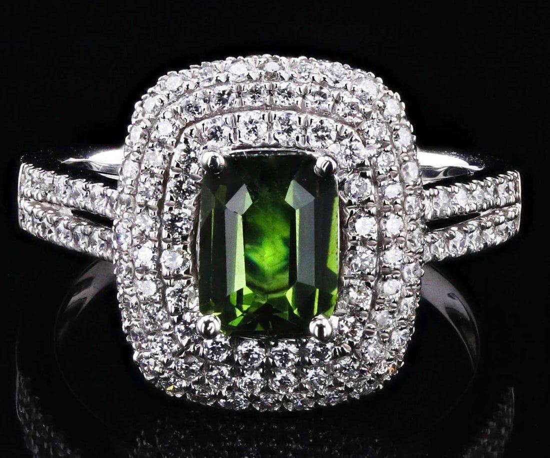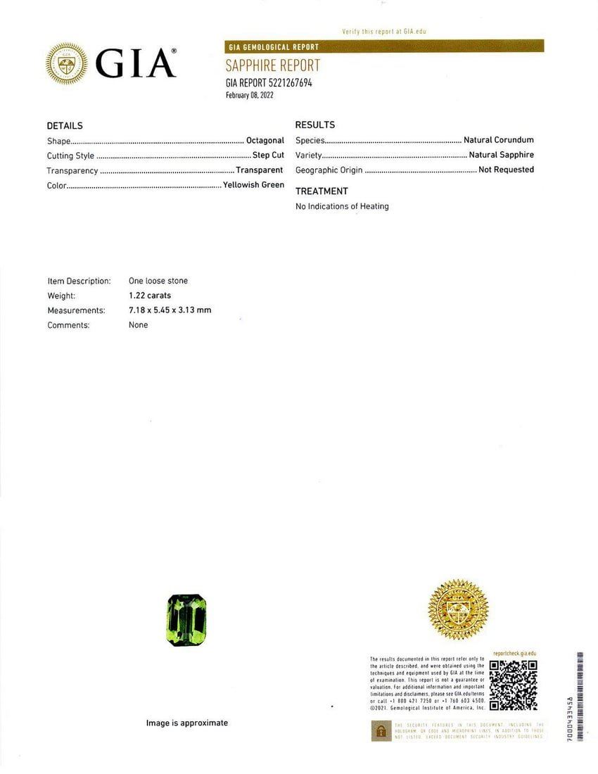 Platinum Green Sapphire & Diamond Ring One polished, stamped, and tested platinum ring marked Sheffield & Sons. The ring is mounted with: 1 genuine GIA certified unheated sapphire center stone weighing 1.22carats, and 152 genuine round diamonds weighing approximately 0.88 carats. This item weighs 7.8 grams, condition is new, excellent workmanship. *MAIN GEMSTONE* GIA Report No.: 5221267694 Species: NaturalCorundum Variety: Natural Sapphire Shape: Octagonal Cutting Style: Step Cut Measurements: 7.18 x 5.45 x 3.13mm Weight: 1.22 carats Color: Yellowish Green Transparency: Transparent Treatment: NoneRefractive Index: 1.762 - 1.770 DR Birefringence: 0.008 - 0.010 Hardness: 9 *ADJACENT GEMSTONES ON RING* Identity: Natural Diamond Shape: Round Cutting Style: Brilliant Cut Quantity: 152 DiamondsMeasurements: 1.1mm Total Weight: 0.88 carats Clarity Grade: VS2 - SI1 Color Grade: G - H Refractive Index: 2.418 Hardness: 10