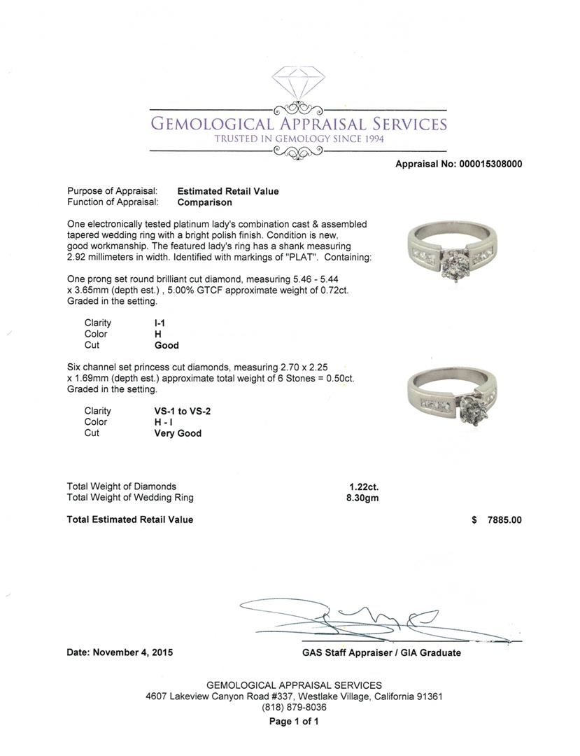One electronically tested platinum lady's combination cast & assembled tapered wedding ring with a bright polish finish. The featured lady's ring has a shank measuring 2.92 millimeters in width. Identified with markings of "PLAT". Condition is new, good workmanship. Containing: One prong set round brilliant cut diamond, measuring 5.46 - 5.44 x 3.65mm (depth est.) , 5.00% GTCF approximate weight of 0.72ct. Graded in the setting. Clarity: I-1. Color: Good Six channel set princess cut diamonds, measuring 2.70 x 2.25 x 1.69mm (depth est.) approximate total weight of 6 Stones = 0.50ct. Graded in the setting. Clarity: VS-1 to VS-2. Color: H - I. Cut Very Good. Total Weight of Diamonds 1.22ct. Total Weight of Wedding Ring 8.30gm GAS Appraised at $7,885.00.