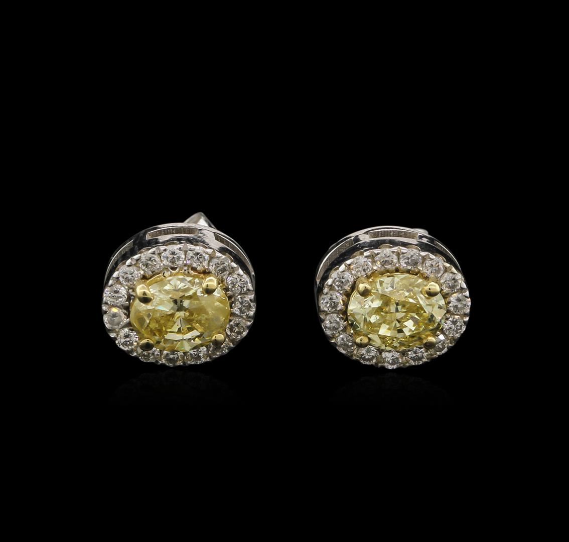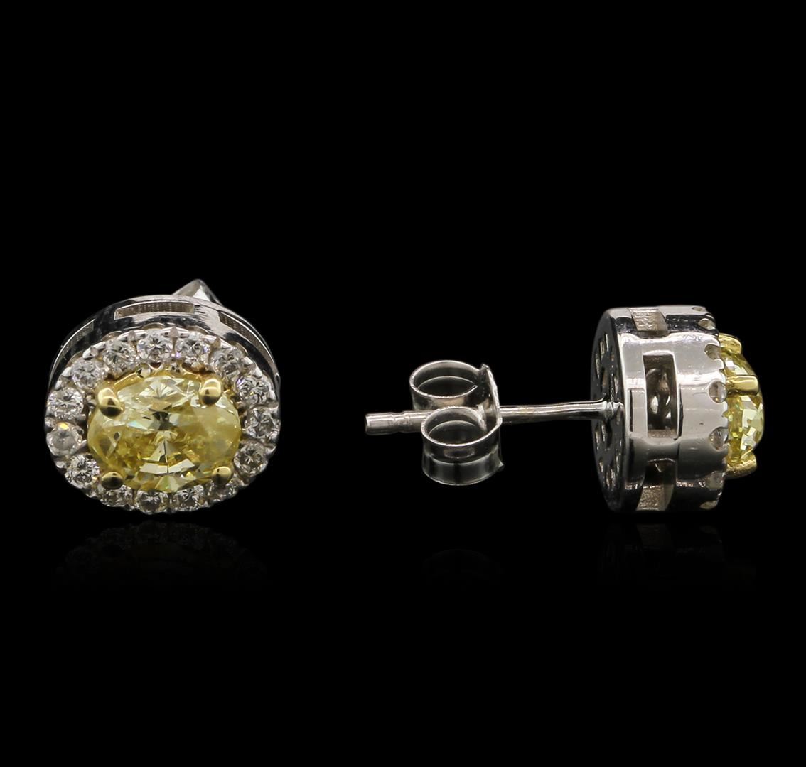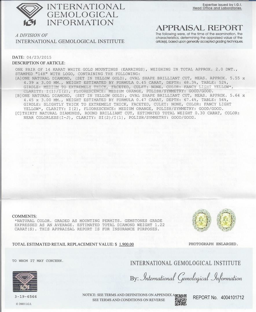One pair of 14 karat white gold mountings (earrings), weighing in total approx. 2.0 dwt., stamped "14K" with logo, containing the following: [A] One natural diamond, (set in yellow gold), oval shape brilliant cut, meas. Approx. 5.55 x 4.39 x 3.00 mm., weight estimated by formula 0.45 carat, depth: 68.3%, table: 52%, girdle: medium to extremely thick, faceted, culet: none, color: fancy light yellow, clarity: I(1)/I(2), fluorescence: medium orange, polish/symmetry: good/good. [B] One natural diamond, (set in yellow gold), oval shape brilliant cut, meas. approx. 5.64 x 4.45 x 3.00 mm., weight estimated by formula 0.47 carat, depth: 67.4%, table: 56%, girdle: slightly thick to extremely thick, faceted, culet: none, color: fancy light yellow, clarity: I(2), fluorescence: medium orange, polish/symmetry: good/good. [C] Thirty natural diamonds, round brilliant cut, estimated total weight 0.30 carat, color: near colorless (I-J), clarity: SI (2)/I(1), polish/symmetry: good/good. IGI Appraised at $1,900.00.