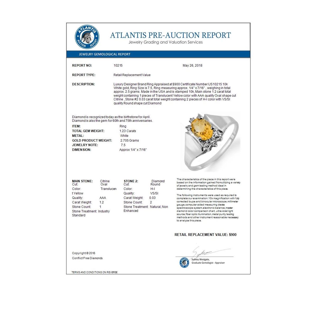 REF-14T5M -10215 ---- 1.23 CTW Citrine & Diamond Ring 10K White Gold ---- Luxury Designer Brand Ring Appraised at $900 Certificate Number US10215 10k White gold, Ring Size is 7.5, Ring measuring approx. 1/4" x 7/16" , weighing in total approx. 2.5 grams. Made in the USA and is stamped 10k, Main stone 1.2 carat total weight containing 1 pieces of Translucent Yellow color with AAA quality Oval shape cut Citrine , Stone #2 0.03 carat total weight containing 2 pieces of H-I color with VS/SI quality Round shape cut Diamond