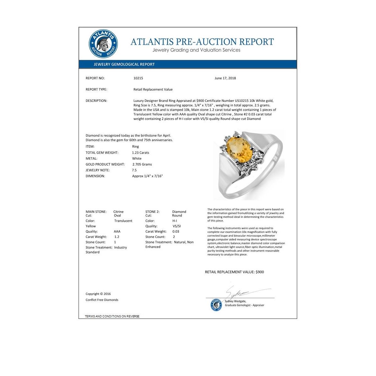 REF-14T5M -10215 ---- 1.23 CTW Citrine & Diamond Ring 10K White Gold ---- Luxury Designer Brand Ring Appraised at $900 Certificate Number US10215 10k White gold, Ring Size is 7.5, Ring measuring approx. 1/4" x 7/16" , weighing in total approx. 2.5 grams. Made in the USA and is stamped 10k, Main stone 1.2 carat total weight containing 1 pieces of Translucent Yellow color with AAA quality Oval shape cut Citrine , Stone #2 0.03 carat total weight containing 2 pieces of H-I color with VS/SI quality Round shape cut Diamond