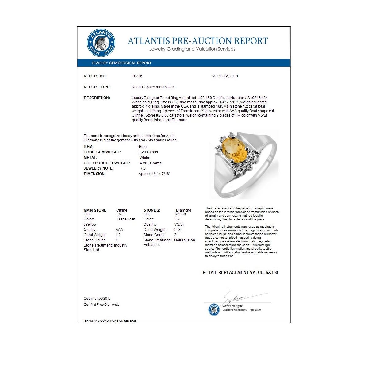 REF-35W5F -10216 ---- 1.23 CTW Citrine & Diamond Ring 18K White Gold ---- Luxury Designer Brand Ring Appraised at $2,150 Certificate Number US10216 18k White gold, Ring Size is 7.5, Ring measuring approx. 1/4" x 7/16" , weighing in total approx. 4 grams. Made in the USA and is stamped 18k, Main stone 1.2 carat total weight containing 1 pieces of Translucent Yellow color with AAA quality Oval shape cut Citrine , Stone #2 0.03 carat total weight containing 2 pieces of H-I color with VS/SI quality Round shape cut Diamond