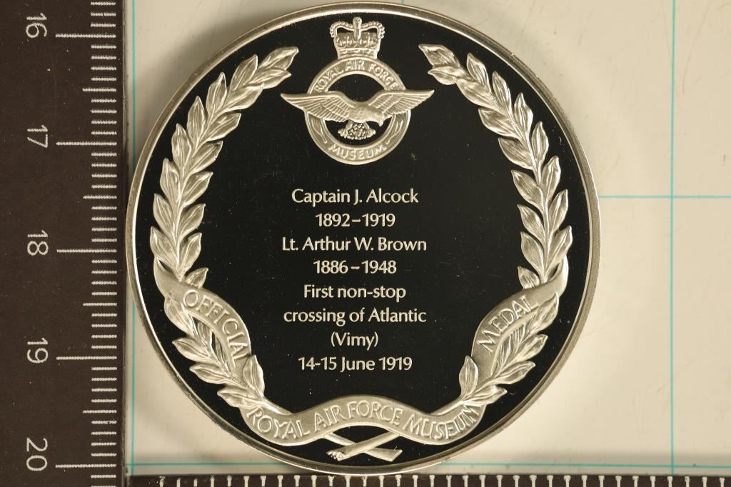 CAPTIAN J. ALCOCK, 1892-1919, LT. ARTHUR W. BROWN, 1886-1948 FIRST NON-STOP CROSSING OF ATLANTIC (VIMY) 14, 15 JUNE 1919. OFFICIAL ROYAL AIRFORCE MUSEUM MEDAL IN HARD PLASTIC CAPSULE