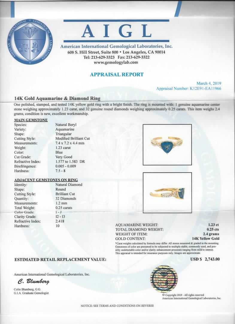 One polished, stamped, and tested 14K yellow gold ring with a bright ?nish. The ring is mounted will: 1 genuine aquamarine center stone weighing approximately 1.23 carat, and 32 genuine round diamonds weighing approximately 0.25 carts. This item weighs 2.4 grams, condition is new, excellent workmanship. MAIN GEMSTONE Species: Natural Beryl Variety : Aquamarine Shape: Triangular Cutting Style: Modi?ed Brilliant Cut Measurements: 704 x 7.2 x 4.4 mm Weight: 1.23 carat Color: Blue Cut Grade: Very Good Refractive Index: 1.577 to 1.583 DR Birefringence: 0,005 - 0.009 Hardness: 7.5 - 8 ADJACENT GEMSTONES ON RING Identity: Natural Diamond Shape: Round Cutting Style: Brilliant Cut Quantity: 32 Diamonds Measurements: 1.2 mm Total Weight: 0.25 carats Color Grade: I - J Clarity Grade: I2 - I3 Refractive Index: 2.418 Hardness: 10 AQUAMARINE WEIGHT: 1.23ct TOTAL DIAMOND WEIGHT: 0.25 cts WEIGHT OF ITEM: 2 4 grams GOLD CONTENT: 14K Yellow Gold ESTIMATED RETAIL REPLACEMENT VALUE: USD $ 2,743.00