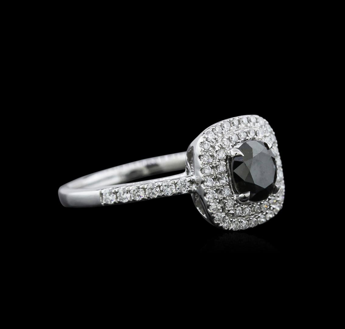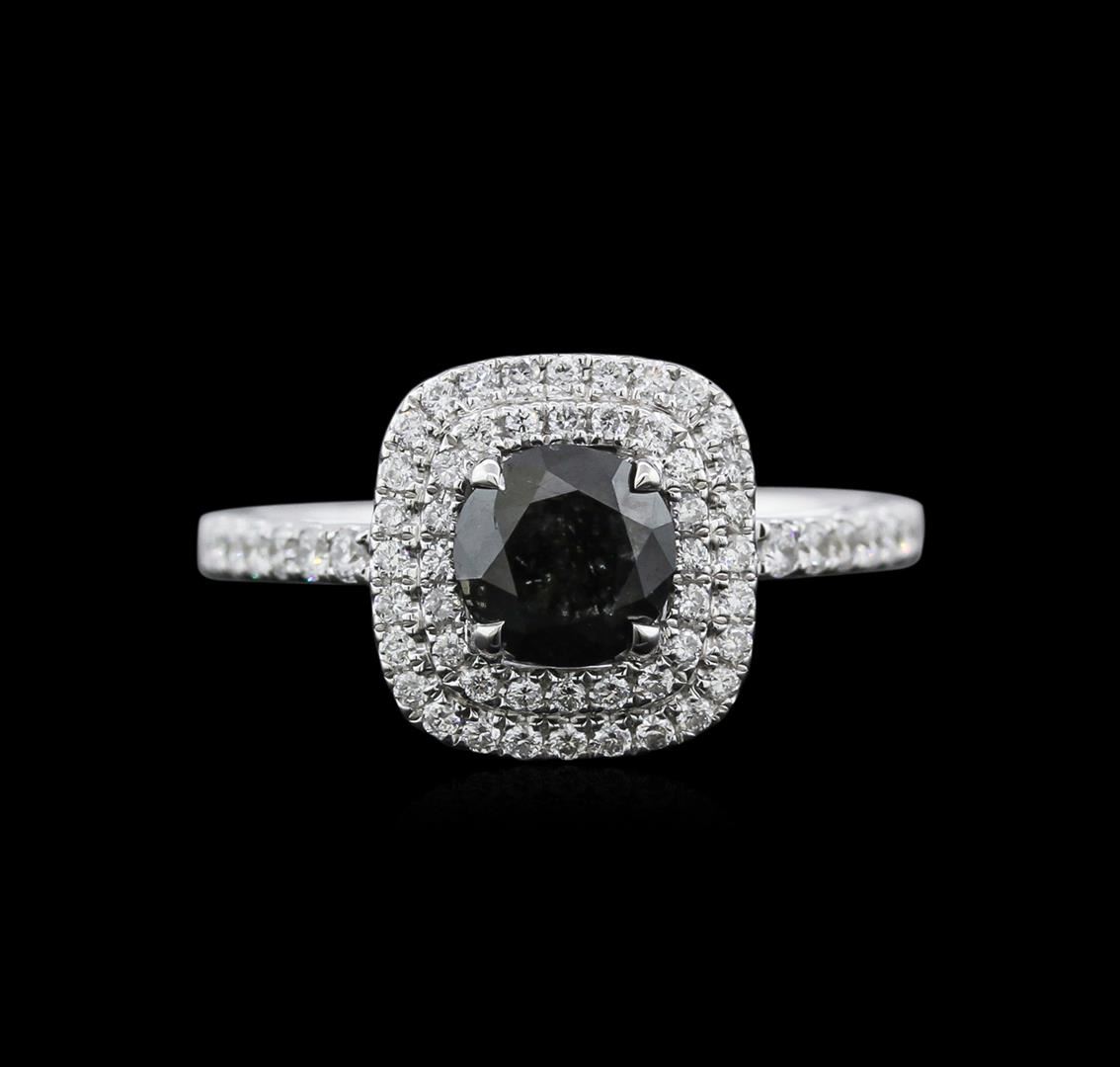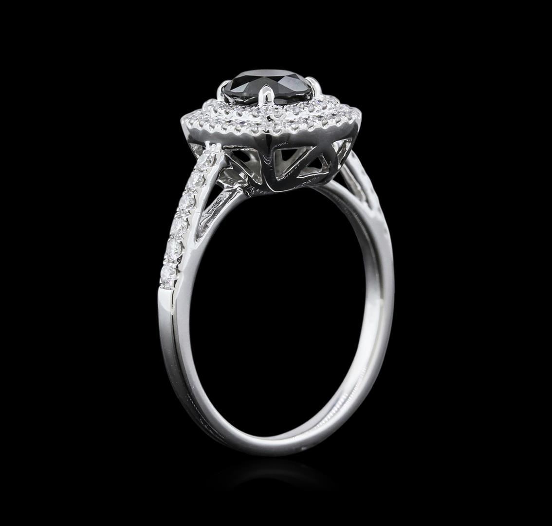 One electronically tested 14KT white gold ladies cast diamond engagement ring with a bright polish finish. Identified with markings of "14K". Condition is new. Containing: One prong set round brilliant cut diamond, measuring 5.90 - 5.90 x 3.54mm (depth est.) approximate weight of 0.75ct. color of fancy black, cut is Good. Sixty prong set round brilliant cut diamonds, measuring 1.50 - 1.10 x 0.78mm (depth est.) approximate total weight of 60 Stones = 0.48ct. Clarity: SI-1 to SI-2. Color: H - I, Cut is Good. Diamonds are graded in the mounting, unless otherwise stated. Total Weight of Diamonds 1.23ct. Total Weight of Engagement Ring 3.60gm. GGL Appraised at $2,390.00.