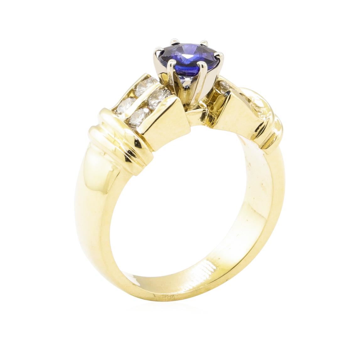 One electronically tested 14KT yellow gold lady's combination cast & assembled fashion ring with a double row cathedral shank with a bright polish finish. The featured lady's ring has two cuff motifs and a shank measuring 3.75 millimeters wide. Identified with markings of '14K'. Condition is like new, good workmanship. Containing: One prong set round modified mixed cut natural blue sapphire, measuring 5.65 - 5.58 x 3.00 mm, (depth est.) approximate weight of 0.78ct., clarity is eye clean, medium dark, moderately strong, blue color, (GIA B 6/4), cut is good. Transmitting light with no distortion, transparent. Colored gemstones are presumed to have been subjected to commonly used enhancement processes. Graded in the setting. Eight channel set round brilliant cut diamonds, measuring 2.50 - 2.40 x 1.52mm (depth est.) approximate total weight of 8 Stones = 0.45ct. Graded in the setting. Color H - I Clarity SI-2 to I-1 Cut Good. Total Weight of Colored Stones 0.78ct.. Total Weight of Diamonds 0.45ct.. Total Weight of Ring 7.90gm GAS Appraised at $3100.00. GAS Appraised.