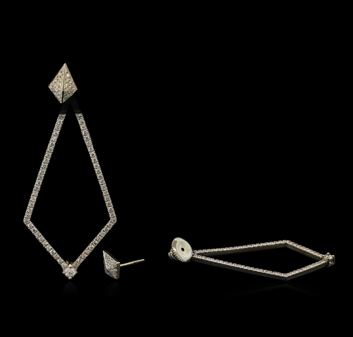 One pair electronically tested 14KT white gold lady's combination cast & assembled dangle earrings with heavy friction backs with a bright polish finish. Identified with markings of "14K". Condition is new, good workmanship. Containing: Two prong set round brilliant cut diamonds, measuring 2.80 - 2.70 x 1.65mm (depth est.) approximate total weight of 2 Stones = 0.15ct. Graded in the setting. Clarity: SI-2 to I-1. Color: I. Cut Good One Hundred Twenty-Four bead set round brilliant cut diamonds, measuring 1.30 - 1.20 x 0.78mm (depth est.) approximate total weight of 124 Stones = 0.92ct. Graded in the setting. Clarity: SI-2 to I-1. Color: H - J. Cut Good Forty-Four bead set round brilliant cut diamonds, measuring 1.00 - 0.95 x 0.63mm (depth est.) approximate total weight of 44 Stones = 0.16ct. Graded in the setting. Clarity: SI-2 to I-1. Color: H - I. Cut Good. Total Weight of Diamonds 1.23ct. Total Weight of Earrings 8.00gm. GAS Appraised at $5,285.00.