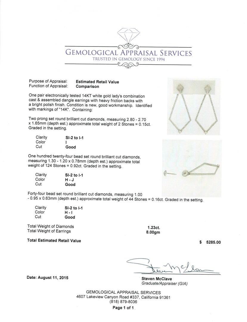 One pair electronically tested 14KT white gold lady's combination cast & assembled dangle earrings with heavy friction backs with a bright polish finish. Identified with markings of "14K". Condition is new, good workmanship. Containing: Two prong set round brilliant cut diamonds, measuring 2.80 - 2.70 x 1.65mm (depth est.) approximate total weight of 2 Stones = 0.15ct. Graded in the setting. Clarity: SI-2 to I-1. Color: I. Cut Good One Hundred Twenty-Four bead set round brilliant cut diamonds, measuring 1.30 - 1.20 x 0.78mm (depth est.) approximate total weight of 124 Stones = 0.92ct. Graded in the setting. Clarity: SI-2 to I-1. Color: H - J. Cut Good Forty-Four bead set round brilliant cut diamonds, measuring 1.00 - 0.95 x 0.63mm (depth est.) approximate total weight of 44 Stones = 0.16ct. Graded in the setting. Clarity: SI-2 to I-1. Color: H - I. Cut Good. Total Weight of Diamonds 1.23ct. Total Weight of Earrings 8.00gm. GAS Appraised.
