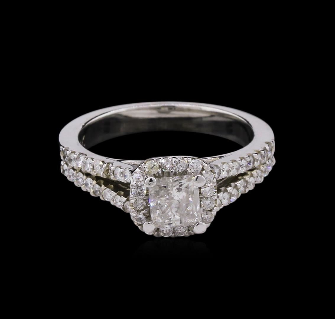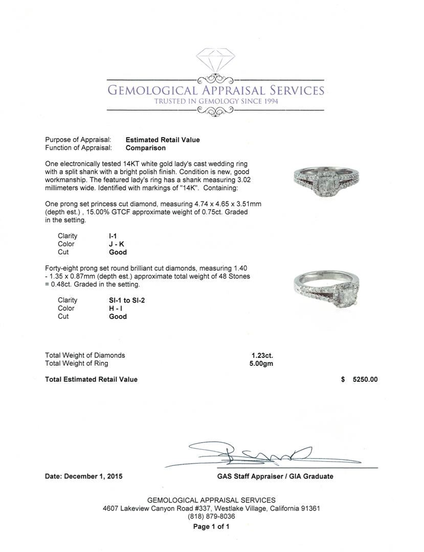 One electronically tested 14KT white gold lady's cast wedding ring with a split shank with a bright polish finish. The featured lady's ring has a shank measuring 3.02 millimeters wide. Identified with markings of "14K". Condition is new, good workmanship. Containing: One prong set princess cut diamond, measuring 4.74 x 4.65 x 3.51mm (depth est.) , 15.00%. GTCF approximate weight of 0.75ct. Graded in the setting. Clarity: I-1 . Color: J - K. Cut Good Forty-Eight prong set round brilliant cut diamonds, measuring 1.40 - 1.35 x 0.87mm (depth est.) approximate total weight of 48 Stones = 0.48ct. Graded in the setting. Clarity: SI-1 to SI-2 . Color: H - I. Cut Good. Total Weight of Diamonds 1.23ct.. Total Weight of Ring 5.00gm at $ 5250.00 GAS Appraised.