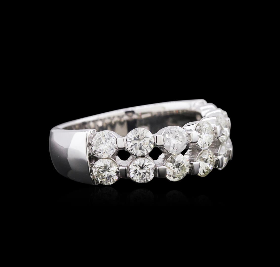 One electronically tested 14KT white gold ladies cast diamond ring with a bright polish finish. Identified with markings of "14K". Condition is new. Containing: Fourteen prong set round brilliant cut diamonds, measuring 3.20 - 3.20 x 1.92mm (depth est.) approximate total weight of 14 Stones = 1.23ct. Clarity: I-1 to I-2. Color: I - J, Cut is Good. Diamonds are graded in the mounting, unless otherwise stated. Total Weight of Diamonds 1.23ct. Total Weight of Ring 6.20 grams. GGL Appraised.