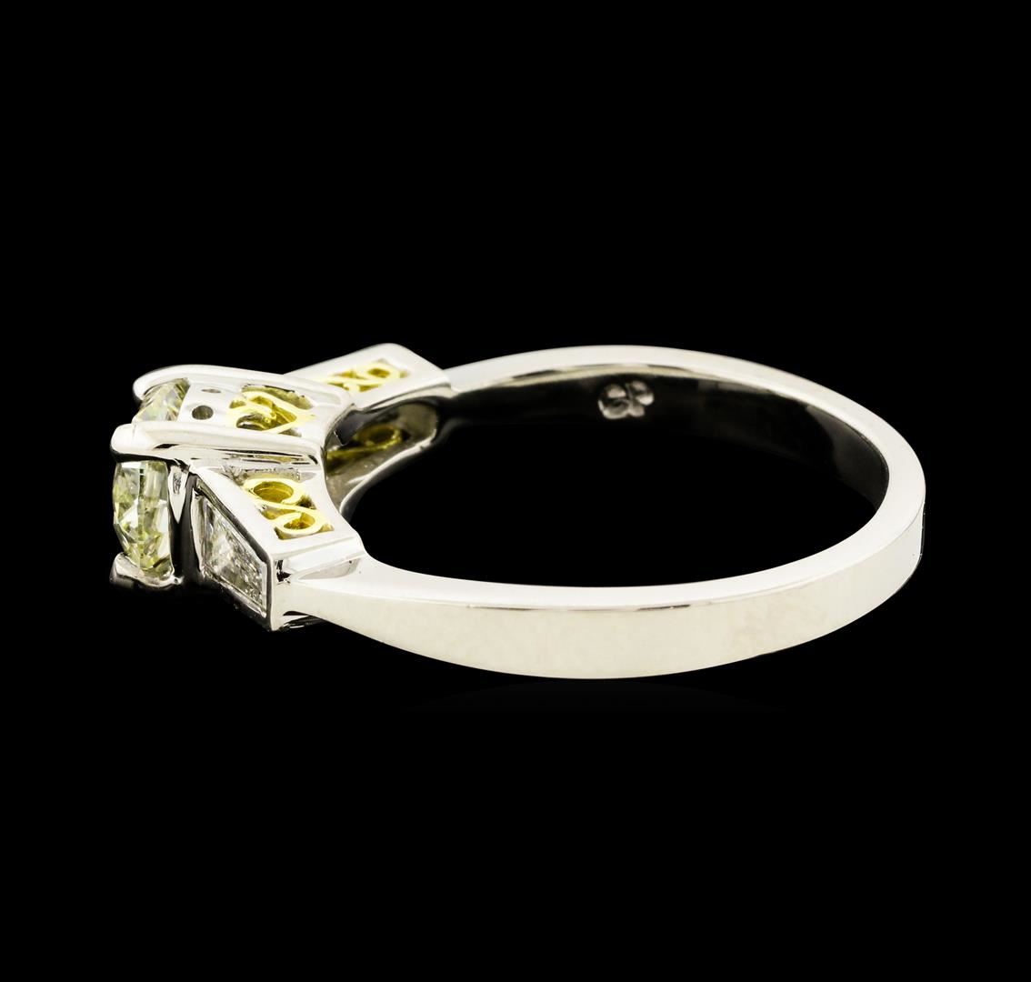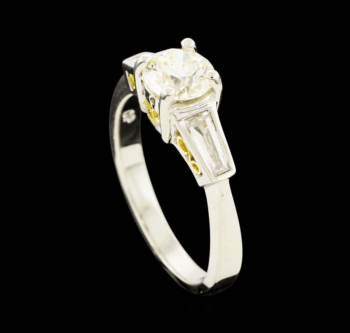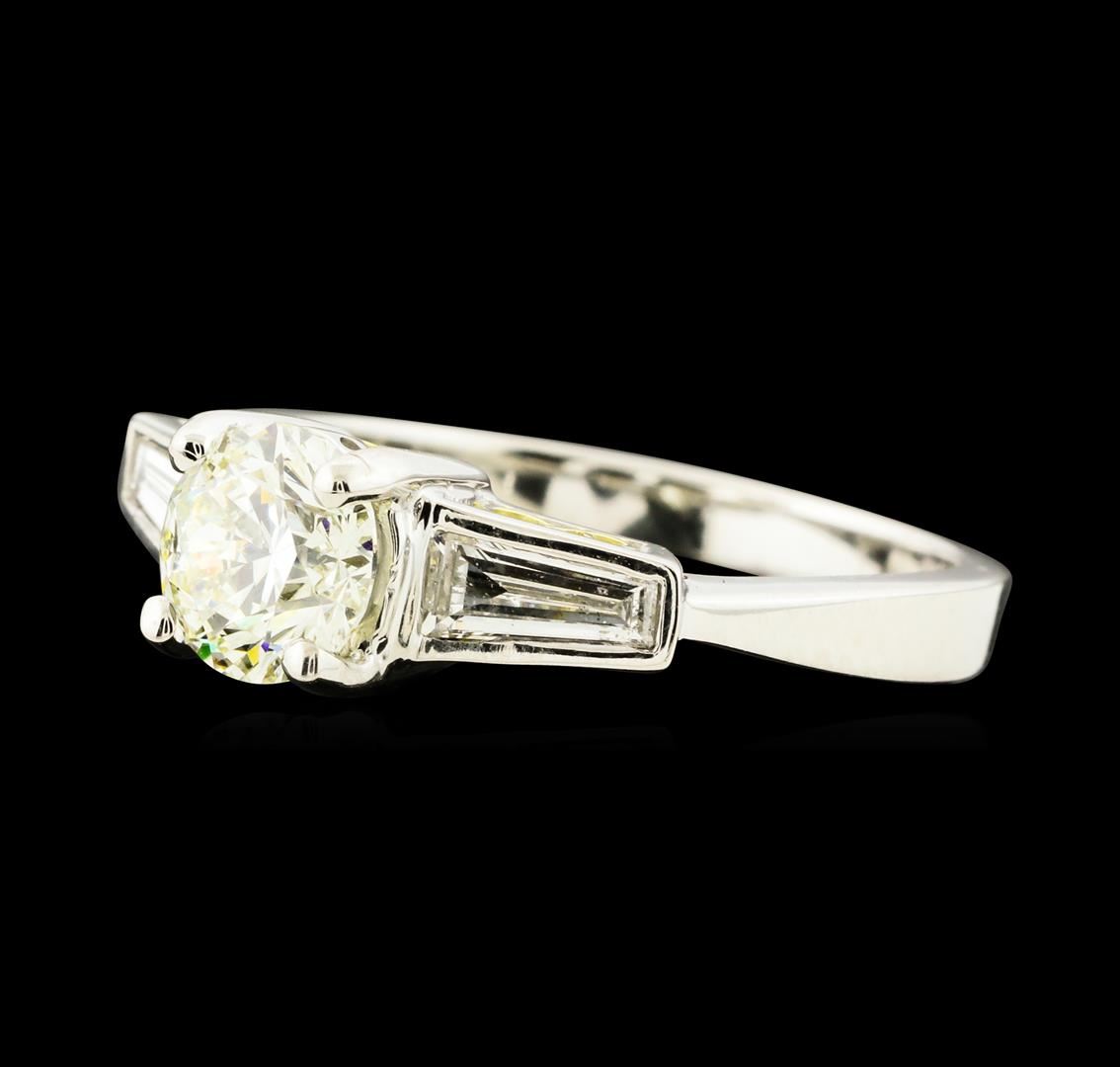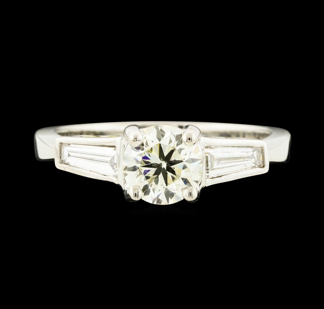 One electronically tested platinum lady's combination cast & assembled wedding ring with a cathedral shank with a bright polish finish. The featured lady's ring has an 18KT yellow gold filigree under gallery and a shank measuring 2.23 millimeters wide. Identified with markings of 'PT'. Condition is new, good workmanship. Containing: One prong set round brilliant cut diamond, measuring 5.93 - 5.91 x 3.69mm (depth est.) approximate weight of 0.83ct. Graded in the setting. Clarity SI-1. Color: I - J Cut Very Good Two bezel set baguette cut (tapered) diamonds, measuring from 5.45 x 2.20 x 1.87mm (depth est.) to 5.60 x 2.30 x 1.95mm (depth est.) approximate total weight of 2 Stones = 0.40ct. Graded in the setting. Clarity VS-2 to SI-1. Color: G - H Cut Very Good. Total Weight of Diamonds 1.23ct.. Total Weight of Ring 5.00gm. GAS Appraised at $7,200.00.