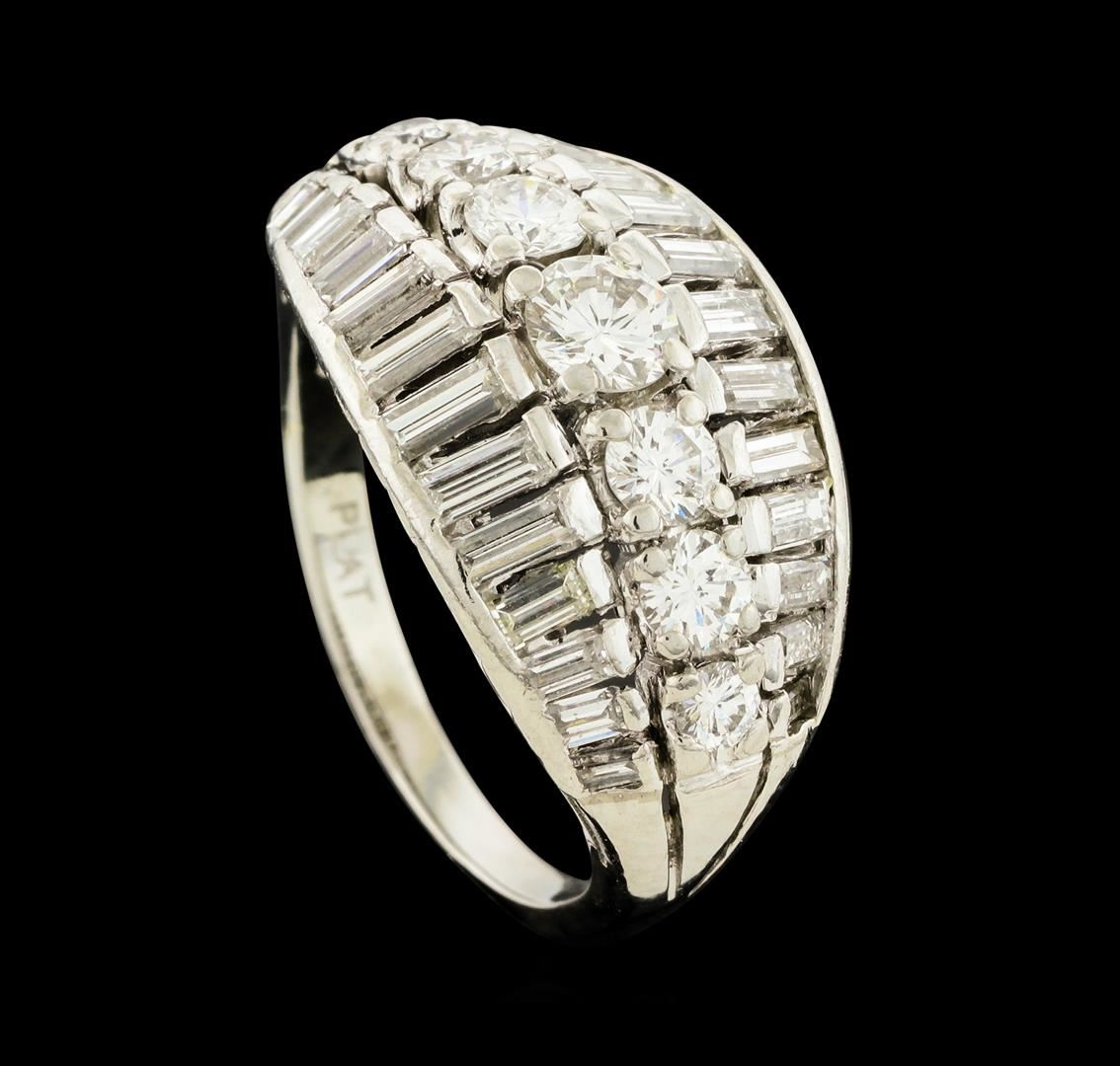 One electronically tested platinum lady's combination cast & assembled fashion ring with a tapered split shank with a bright polish finish. The featured lady's ring has a shank measuring 1.71 millimeters wide. Identified with markings of 'PLAT'. Condition is used, good workmanship. Containing: One prong set round brilliant cut diamond, measuring 3.58 - 3.55 x 2.23mm (depth est.) approximate weight of 0.18ct. Graded in the setting. Clarity VS-2. Color: G Cut Good Six prong set round brilliant cut diamonds, measuring 2.90 - 2.50 x 1.67mm (depth est.) approximate total weight of 6 Stones = 0.45ct. Graded in the setting. Clarity VS-2 to SI-1. Color: G - H Cut Good Twenty-Six prong set baguette cut diamonds, measuring from 1.80 x 0.80 x 0.68mm (depth est.) to 3.10 x 1.40 x 1.19mm (depth est.) approximate total weight of 26 Stones = 0.60ct. Graded in the setting. Clarity VS-1 to VS-2. Color: F - G Cut Very Good. Total Weight of Diamonds 1.23ct.. Total Weight of Ring 6.80gm. GAS Appraised at $4,805.00.
