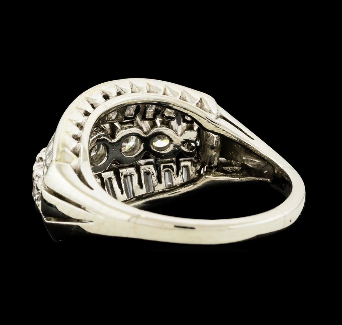 One electronically tested platinum lady's combination cast & assembled fashion ring with a tapered split shank with a bright polish finish. The featured lady's ring has a shank measuring 1.71 millimeters wide. Identified with markings of 'PLAT'. Condition is used, good workmanship. Containing: One prong set round brilliant cut diamond, measuring 3.58 - 3.55 x 2.23mm (depth est.) approximate weight of 0.18ct. Graded in the setting. Clarity VS-2. Color: G Cut Good Six prong set round brilliant cut diamonds, measuring 2.90 - 2.50 x 1.67mm (depth est.) approximate total weight of 6 Stones = 0.45ct. Graded in the setting. Clarity VS-2 to SI-1. Color: G - H Cut Good Twenty-Six prong set baguette cut diamonds, measuring from 1.80 x 0.80 x 0.68mm (depth est.) to 3.10 x 1.40 x 1.19mm (depth est.) approximate total weight of 26 Stones = 0.60ct. Graded in the setting. Clarity VS-1 to VS-2. Color: F - G Cut Very Good. Total Weight of Diamonds 1.23ct.. Total Weight of Ring 6.80gm. GAS Appraised at $4,805.00.