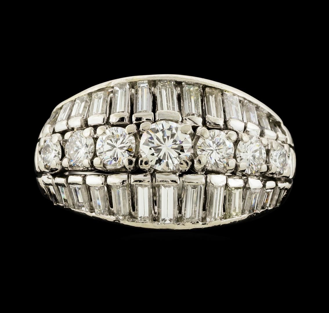 One electronically tested platinum lady's combination cast & assembled fashion ring with a tapered split shank with a bright polish finish. The featured lady's ring has a shank measuring 1.71 millimeters wide. Identified with markings of 'PLAT'. Condition is used, good workmanship. Containing: One prong set round brilliant cut diamond, measuring 3.58 - 3.55 x 2.23mm (depth est.) approximate weight of 0.18ct. Graded in the setting. Clarity VS-2. Color: G Cut Good Six prong set round brilliant cut diamonds, measuring 2.90 - 2.50 x 1.67mm (depth est.) approximate total weight of 6 Stones = 0.45ct. Graded in the setting. Clarity VS-2 to SI-1. Color: G - H Cut Good Twenty-Six prong set baguette cut diamonds, measuring from 1.80 x 0.80 x 0.68mm (depth est.) to 3.10 x 1.40 x 1.19mm (depth est.) approximate total weight of 26 Stones = 0.60ct. Graded in the setting. Clarity VS-1 to VS-2. Color: F - G Cut Very Good. Total Weight of Diamonds 1.23ct.. Total Weight of Ring 6.80gm. GAS Appraised at $4,805.00.