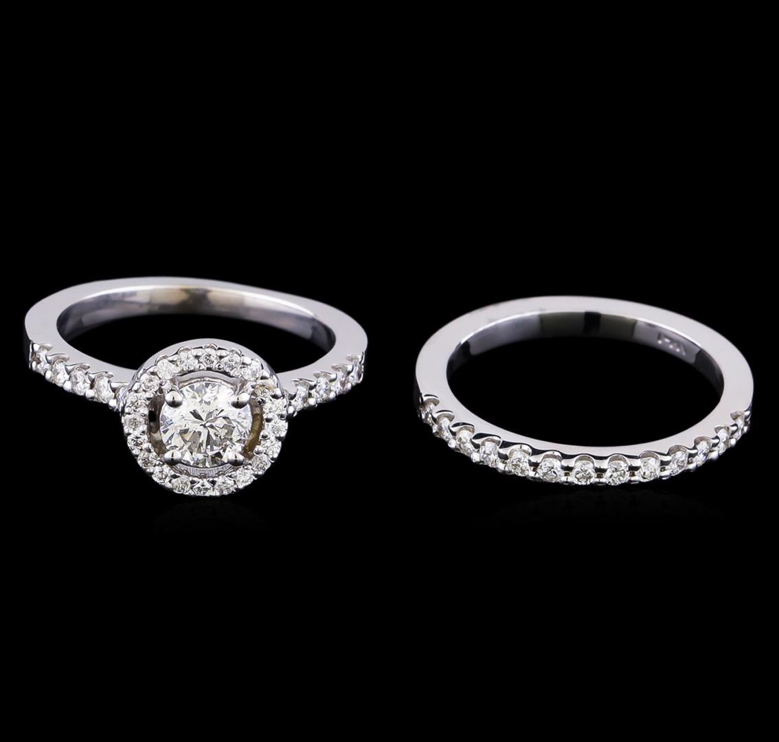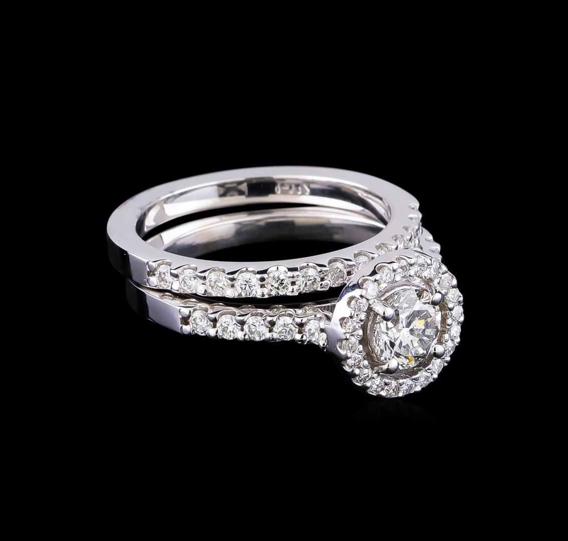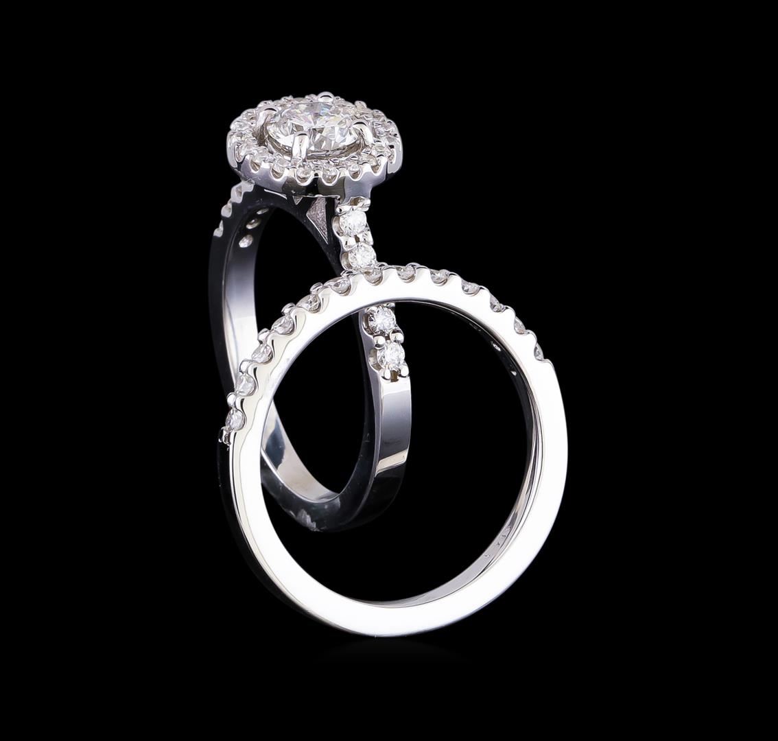 One electronically tested 14KT white gold lady's cast wedding set rings with a halo with a bright polish finish. The featured lady's ring set has a double shank measuring 4.11 millimeters in width. Identified with markings of "14K". Condition is new, good workmanship. Containing: One prong set round brilliant cut diamond, measuring 5.32 - 5.31 x 3.60mm (depth est.) approximate weight of 0.64ct. Graded in the setting. Clarity: SI-2. Color: I - Good Twenty prong set round brilliant cut diamonds, measuring 1.30 - 1.20 x 0.78mm (depth est.) approximate total weight of 20 Stones = 0.15ct. Graded in the setting. Clarity: SI-1 to I-1. Color: H - I. Cut Good Twenty-Three prong set round brilliant cut diamonds, measuring 1.80 - 1.70 x 1.05mm (depth est.) approximate total weight of 23 Stones = 0.44ct. Graded in the setting. Clarity: VS-2 to SI-2. Color: H - I. Cut Good. Total Weight of Diamonds 1.23ct. Total Weight of Rings 6.70gm GAS Appraised.