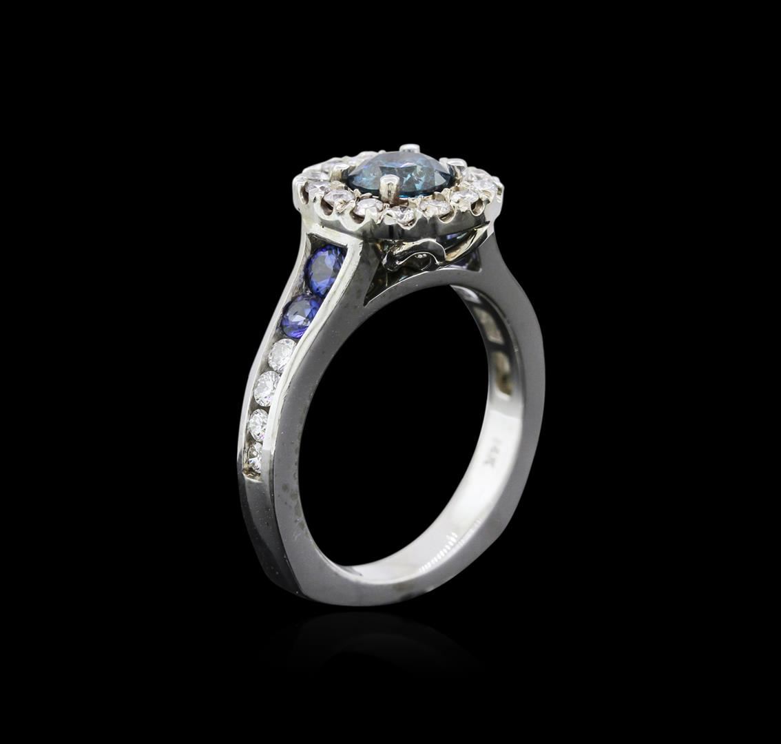 One electronically tested 14KT white gold ladies cast diamond and sapphire ring with a bright polish finish. The featured diamond is set within a diamond bezel supported by diamond and sapphire set shoulders, completed by a two and one-half millimeter wide band. Identified with markings of "14K". Condition is new, good workmanship. Containing: One prong set round brilliant cut diamond, measuring 5.90 - 5.80 x 3.51mm (depth est.) approximate weight of 0.75ct. Indications of laboratory irradiated enhanced color. Graded in the setting. Clarity I-1 Depth 60.0%. Table 54.7%. Twenty-Two prong & channel set round brilliant cut diamonds approximate total weight of 22 Stones = 0.48ct. Graded in the setting. Clarity SI-2 to I-1 Color G - I Four channel set round mixed cut natural blue sapphires approximate total weight of 0.48ct., clarity is slightly included, type II, dark, moderately strong, blue color, (GIA B 7/4), cut is good. Transmitting light with a minimum of distortion, transparent. Naturally occurring internal & external characteristics are present. Color grade is an average for the group. Indications of laboratory high temperature diffusion treatment. Graded in the setting. Total Weight of Colored Stones 0.48ct. Total Weight of Diamonds 1.23ct. Total Weight of Ring 6.22 grams. AIG Appraised at $5,030.00.