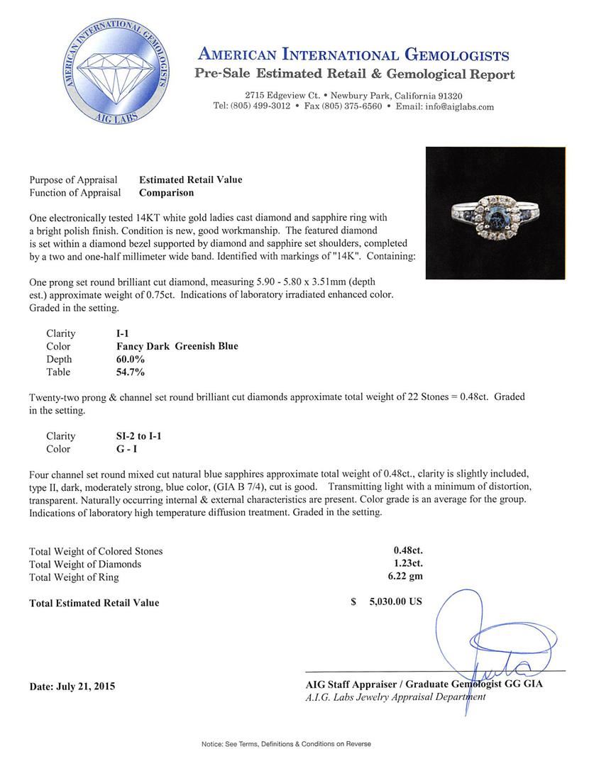 One electronically tested 14KT white gold ladies cast diamond and sapphire ring with a bright polish finish. The featured diamond is set within a diamond bezel supported by diamond and sapphire set shoulders, completed by a two and one-half millimeter wide band. Identified with markings of "14K". Condition is new, good workmanship. Containing: One prong set round brilliant cut diamond, measuring 5.90 - 5.80 x 3.51mm (depth est.) approximate weight of 0.75ct. Indications of laboratory irradiated enhanced color. Graded in the setting. Clarity I-1 Depth 60.0%. Table 54.7%. Twenty-Two prong & channel set round brilliant cut diamonds approximate total weight of 22 Stones = 0.48ct. Graded in the setting. Clarity SI-2 to I-1 Color G - I Four channel set round mixed cut natural blue sapphires approximate total weight of 0.48ct., clarity is slightly included, type II, dark, moderately strong, blue color, (GIA B 7/4), cut is good. Transmitting light with a minimum of distortion, transparent. Naturally occurring internal & external characteristics are present. Color grade is an average for the group. Indications of laboratory high temperature diffusion treatment. Graded in the setting. Total Weight of Colored Stones 0.48ct. Total Weight of Diamonds 1.23ct. Total Weight of Ring 6.22 grams. AIG Appraised at $5,030.00.