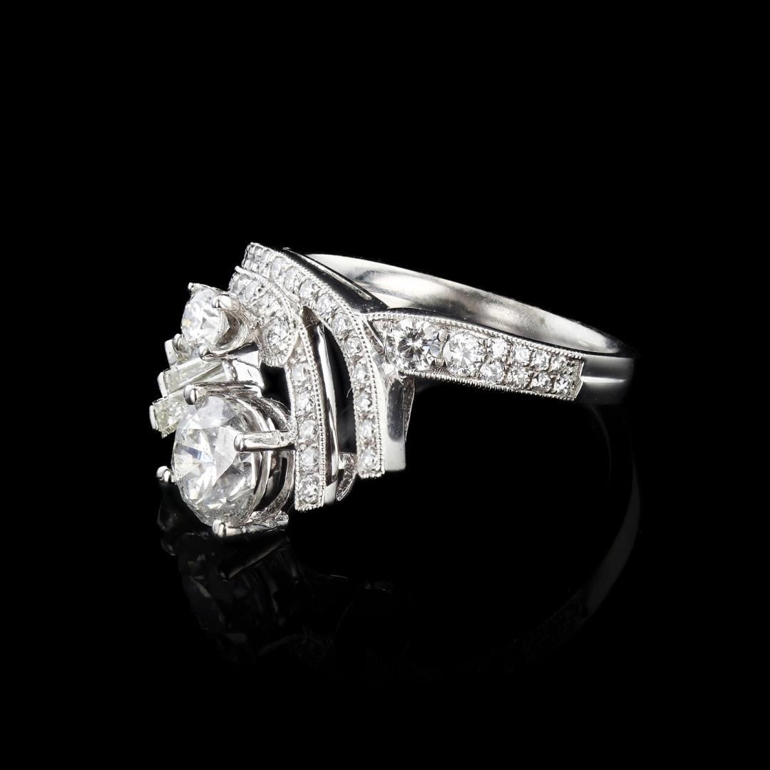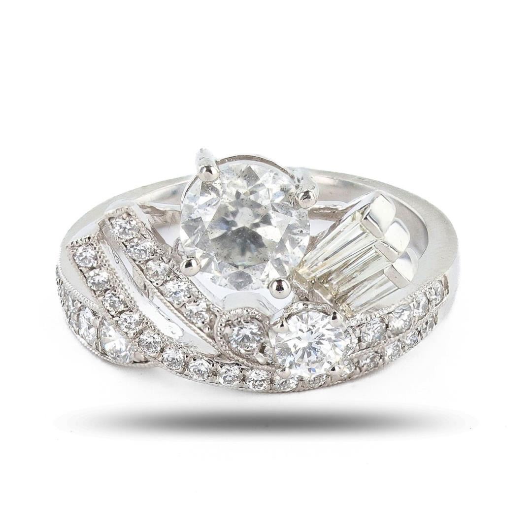 One polished. stamped, and tested platinum ring marked Orianne. The ring is mounted with 1 genuine diamond center stone weighing approximately 1.23 carat, and 44 genuine faceted diamonds weighing approximately 0.99 carats. This item weighs 8.4 grams, condition is new, excellent workmanship. #MAIN GEMSTONE# Identity: Natural Diamond Shape: Round Cutting Style: Brilliant Cut Average Diameter: 6.9mm Weight: 1.23 carat Color Grade: H Clarity Grade: SI3 Cut Grade: Very Good Refractive Index: 2.417 Hardness: 10 #ADJACENT GEMSTONES ON RING# Identity: Natural Diamond Shape & Cutting Style: Baguette / Round Brilliant Quantity: 44 Diamonds Measurements: 3.5 - 5.0mm (3 baguette), 1.2 - 3.8mm (41 round) Total Weight: 0.99 carats Color Grade: F-G Clarity Grade: VS2-SI1 Refractive Index: 2.417 Hardness: 10 CENTER DIAMOND WEIGHT: 1.23 ct TOTAL DIAMOND WEIGHT: 2.22 cts WEIGHT OF ITEM: 8.4 grams METAL: Platinum Size: 7