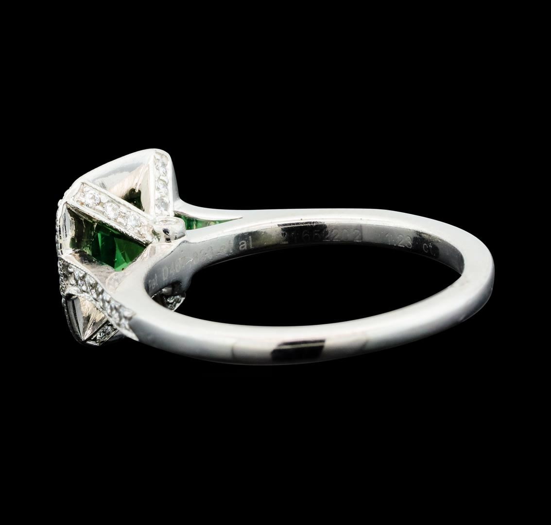 One electronically tested platinum lady's cast fashion ring with a cushion halo with a bright polish with milgrain detailing finish. The featured lady's ring is from the Tiffany Legacy collection and has had the center stone replaced with a cushion cut helenite. Trademark is Tiffany & Co. Identified with markings of 'PT 950'. Condition is like new, good workmanship. Containing: One bezel set square cushion modified mixed cut laboratory created helenite, measuring 6.00 x 6.00 x 4.70mm, (depth est.) approximate weight of 1.23ct., clarity is eye clean, medium, strong, very slightly bluish green color, (GIA vslbG 5/5), cut is very good. 'Helenite' is a trade name used for a man-made glass that is produced using volcanic ash from the 1980 eruption of Mount St. Helens. Colored gemstones are presumed to have been subjected to commonly used enhancement processes. Graded in the setting. Eighteen prong set round brilliant cut diamonds, measuring 1.80 - 1.70 x 1.09mm (depth est.) approximate total weight of 18 Stones = 0.37ct. Graded in the setting. Clarity VS-1 to VS-2. Color: F - G Cut Very Good Twelve prong set round brilliant cut diamonds, measuring 1.50 - 1.40 x 0.90mm (depth est.) approximate total weight of 12 Stones = 0.14ct. Graded in the setting. Clarity VS-1 to VS-2. Color: F - G Cut Very Good Twelve prong set round brilliant cut diamonds, measuring 1.20 - 1.15 x 0.73mm (depth est.) approximate total weight of 12 Stones = 0.08ct. Graded in the setting. Clarity VS-1 to VS-2. Color: F - G Cut Very Good. Total Weight of Colored Stones 1.23ct.. Total Weight of Diamonds 0.59ct.. Total Weight of Ring 5.20gm GAS Appraised at $5,500.00.