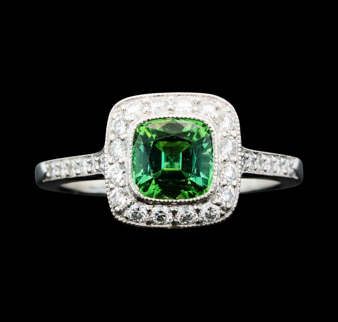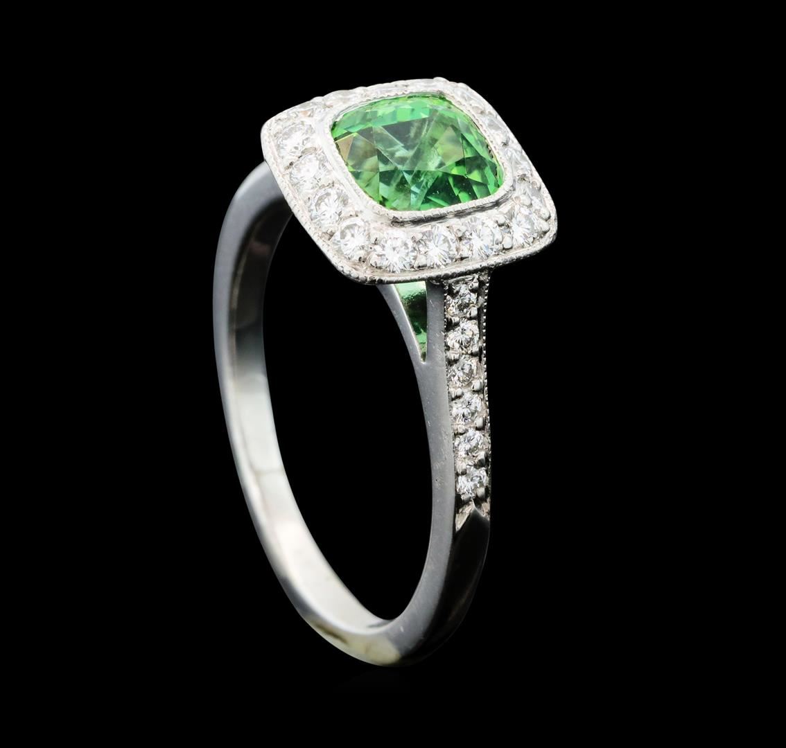 One electronically tested platinum lady's cast fashion ring with a cushion halo with a bright polish with milgrain detailing finish. The featured lady's ring is from the Tiffany Legacy collection and has had the center stone replaced with a cushion cut helenite. Trademark is Tiffany & Co. Identified with markings of 'PT 950'. Condition is like new, good workmanship. Containing: One bezel set square cushion modified mixed cut laboratory created helenite, measuring 6.00 x 6.00 x 4.70mm, (depth est.) approximate weight of 1.23ct., clarity is eye clean, medium, strong, very slightly bluish green color, (GIA vslbG 5/5), cut is very good. 'Helenite' is a trade name used for a man-made glass that is produced using volcanic ash from the 1980 eruption of Mount St. Helens. Colored gemstones are presumed to have been subjected to commonly used enhancement processes. Graded in the setting. Eighteen prong set round brilliant cut diamonds, measuring 1.80 - 1.70 x 1.09mm (depth est.) approximate total weight of 18 Stones = 0.37ct. Graded in the setting. Clarity VS-1 to VS-2. Color: F - G Cut Very Good Twelve prong set round brilliant cut diamonds, measuring 1.50 - 1.40 x 0.90mm (depth est.) approximate total weight of 12 Stones = 0.14ct. Graded in the setting. Clarity VS-1 to VS-2. Color: F - G Cut Very Good Twelve prong set round brilliant cut diamonds, measuring 1.20 - 1.15 x 0.73mm (depth est.) approximate total weight of 12 Stones = 0.08ct. Graded in the setting. Clarity VS-1 to VS-2. Color: F - G Cut Very Good. Total Weight of Colored Stones 1.23ct.. Total Weight of Diamonds 0.59ct.. Total Weight of Ring 5.20gm GAS Appraised at $5,500.00.