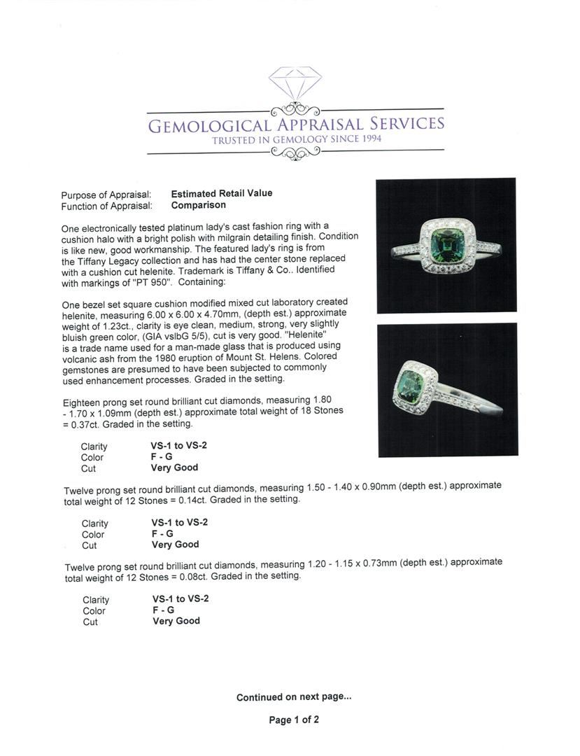 One electronically tested platinum lady's cast fashion ring with a cushion halo with a bright polish with milgrain detailing finish. The featured lady's ring is from the Tiffany Legacy collection and has had the center stone replaced with a cushion cut helenite. Trademark is Tiffany & Co. Identified with markings of 'PT 950'. Condition is like new, good workmanship. Containing: One bezel set square cushion modified mixed cut laboratory created helenite, measuring 6.00 x 6.00 x 4.70mm, (depth est.) approximate weight of 1.23ct., clarity is eye clean, medium, strong, very slightly bluish green color, (GIA vslbG 5/5), cut is very good. 'Helenite' is a trade name used for a man-made glass that is produced using volcanic ash from the 1980 eruption of Mount St. Helens. Colored gemstones are presumed to have been subjected to commonly used enhancement processes. Graded in the setting. Eighteen prong set round brilliant cut diamonds, measuring 1.80 - 1.70 x 1.09mm (depth est.) approximate total weight of 18 Stones = 0.37ct. Graded in the setting. Clarity VS-1 to VS-2. Color: F - G Cut Very Good Twelve prong set round brilliant cut diamonds, measuring 1.50 - 1.40 x 0.90mm (depth est.) approximate total weight of 12 Stones = 0.14ct. Graded in the setting. Clarity VS-1 to VS-2. Color: F - G Cut Very Good Twelve prong set round brilliant cut diamonds, measuring 1.20 - 1.15 x 0.73mm (depth est.) approximate total weight of 12 Stones = 0.08ct. Graded in the setting. Clarity VS-1 to VS-2. Color: F - G Cut Very Good. Total Weight of Colored Stones 1.23ct.. Total Weight of Diamonds 0.59ct.. Total Weight of Ring 5.20gm GAS Appraised at $5,500.00.