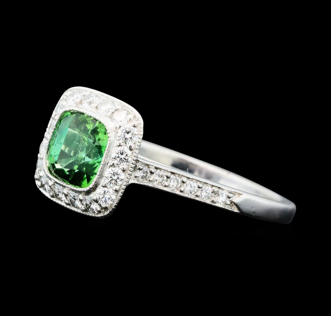 One electronically tested platinum lady's cast fashion ring with a cushion halo with a bright polish with milgrain detailing finish. The featured lady's ring is from the Tiffany Legacy collection and has had the center stone replaced with a cushion cut helenite. Trademark is Tiffany & Co. Identified with markings of 'PT 950'. Condition is like new, good workmanship. Containing: One bezel set square cushion modified mixed cut laboratory created helenite, measuring 6.00 x 6.00 x 4.70mm, (depth est.) approximate weight of 1.23ct., clarity is eye clean, medium, strong, very slightly bluish green color, (GIA vslbG 5/5), cut is very good. 'Helenite' is a trade name used for a man-made glass that is produced using volcanic ash from the 1980 eruption of Mount St. Helens. Colored gemstones are presumed to have been subjected to commonly used enhancement processes. Graded in the setting. Eighteen prong set round brilliant cut diamonds, measuring 1.80 - 1.70 x 1.09mm (depth est.) approximate total weight of 18 Stones = 0.37ct. Graded in the setting. Clarity VS-1 to VS-2. Color: F - G Cut Very Good Twelve prong set round brilliant cut diamonds, measuring 1.50 - 1.40 x 0.90mm (depth est.) approximate total weight of 12 Stones = 0.14ct. Graded in the setting. Clarity VS-1 to VS-2. Color: F - G Cut Very Good Twelve prong set round brilliant cut diamonds, measuring 1.20 - 1.15 x 0.73mm (depth est.) approximate total weight of 12 Stones = 0.08ct. Graded in the setting. Clarity VS-1 to VS-2. Color: F - G Cut Very Good. Total Weight of Colored Stones 1.23ct.. Total Weight of Diamonds 0.59ct.. Total Weight of Ring 5.20gm GAS Appraised at $5,500.00.
