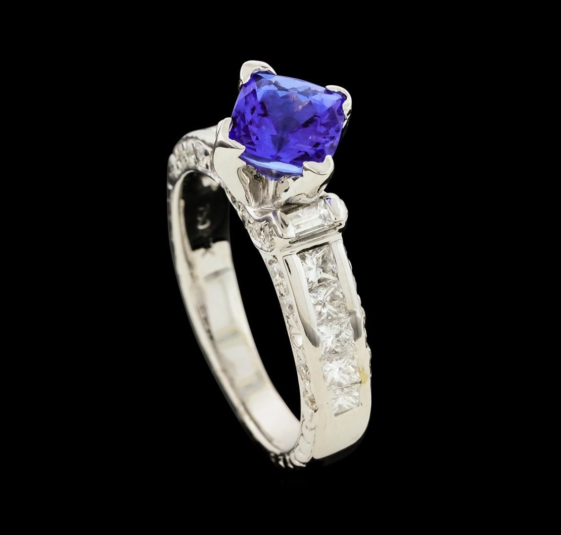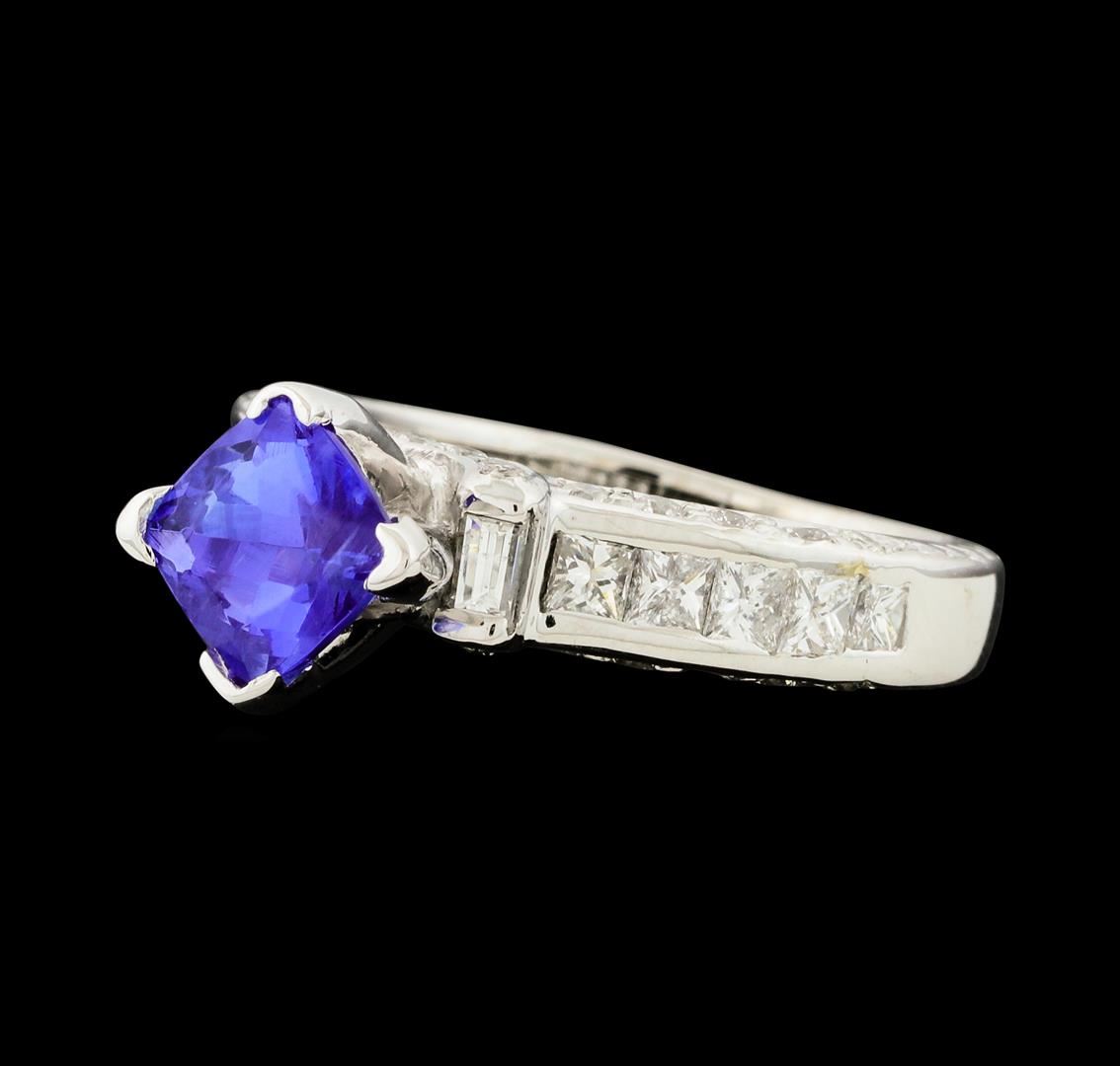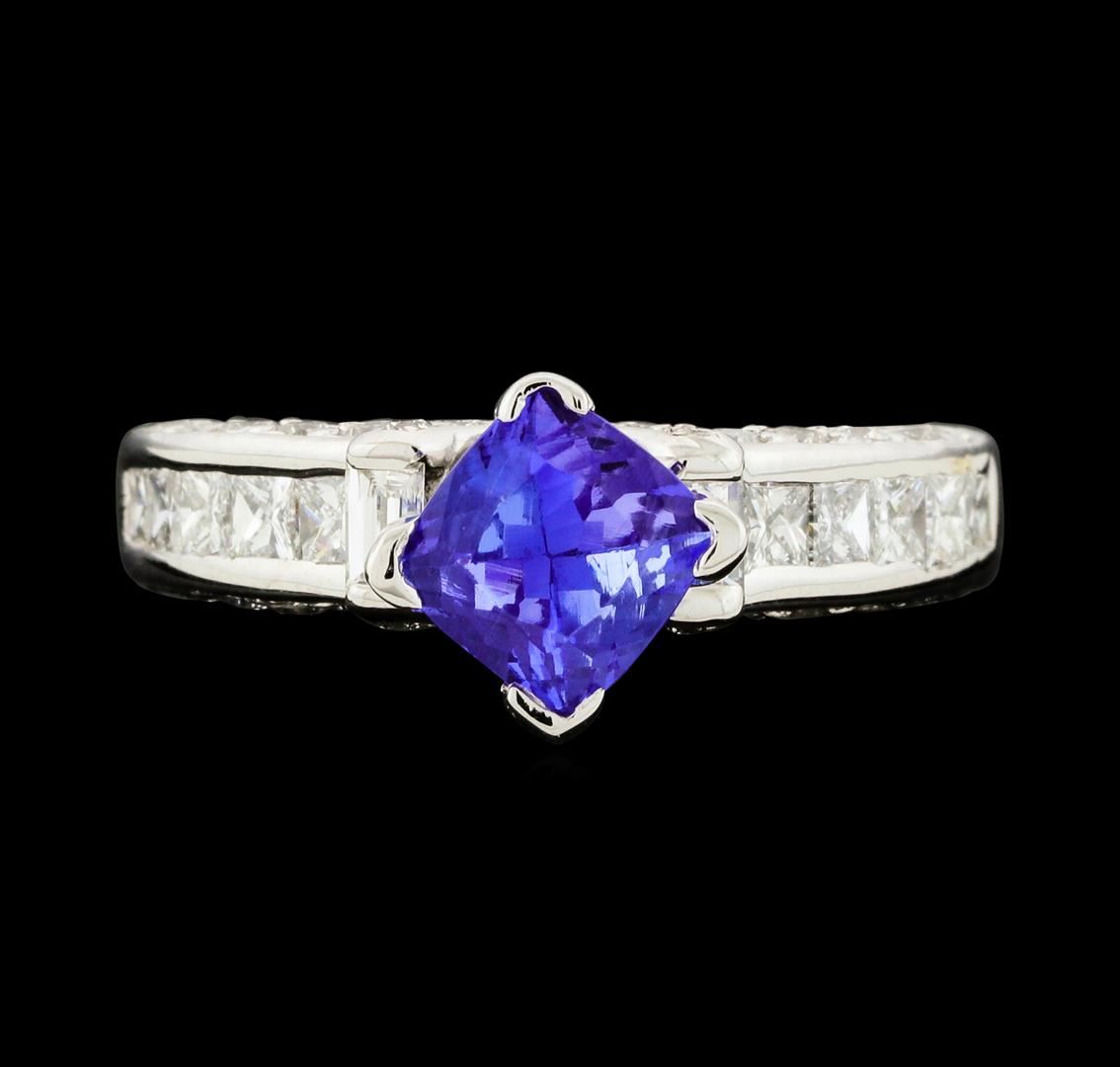 One electronically tested 18KT white gold lady's cast fashion ring with a European shank with a bright polish finish. The featured lady's ring has a shank measuring 2.60 millimeters wide. Identified with markings of '18K 750'. Condition is new, good workmanship. Containing: One prong set square cushion modified brilliant cut natural tanzanite, measuring 6.06 x 5.90 x 4.40mm, (depth est.) approximate weight of 1.23ct., clarity is eye clean, medium dark, moderately strong, violetish blue color, (GIA vB 6/4), cut is good. Transmitting light with no distortion, transparent. Colored gemstones are presumed to have been subjected to commonly used enhancement processes. Graded in the setting. Ten channel set princess cut diamonds, measuring 2.10 x 2.00 x 1.50mm (depth est.) approximate total weight of 10 Stones = 0.52ct. Graded in the setting. Clarity SI-1 to SI-2. Color: H - I Cut Good Thirty-Two prong set round brilliant cut diamonds, measuring 1.60 - 1.25 x 0.89mm (depth est.) approximate total weight of 32 Stones = 0.35ct. Graded in the setting. Clarity SI-1 to SI-3. Color: H - I Cut Good Two channel set baguette cut diamonds, measuring from 3.05 x 1.90 x 1.62mm (depth est.) to 3.10 x 1.95 x 1.66mm (depth est.) approximate total weight of 2 Stones = 0.18ct. Graded in the setting. Clarity SI-1 to SI-2. Color: G - H Cut Good. Total Weight of Colored Stones 1.23ct.. Total Weight of Diamonds 1.05ct.. Total Weight of Ring 6.00gm. GAS Appraised at $4,810.00.