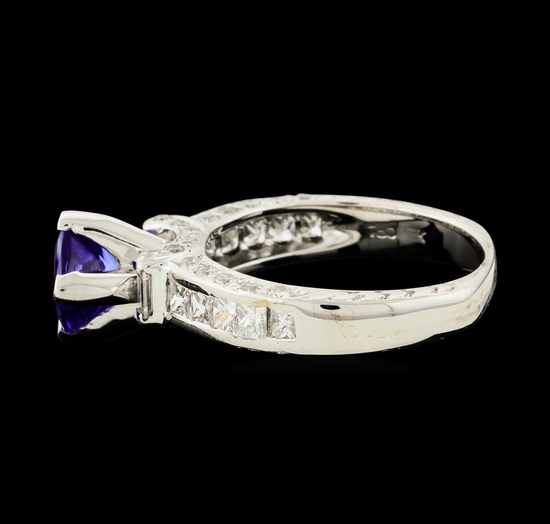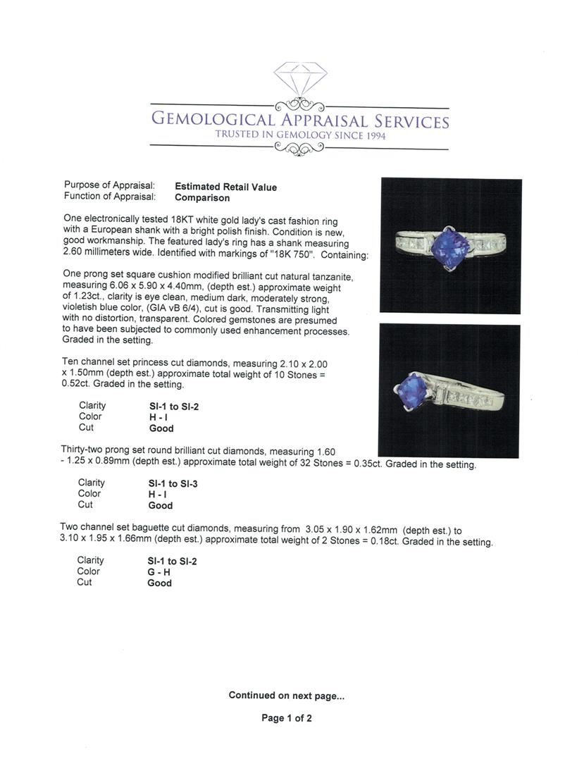 One electronically tested 18KT white gold lady's cast fashion ring with a European shank with a bright polish finish. The featured lady's ring has a shank measuring 2.60 millimeters wide. Identified with markings of '18K 750'. Condition is new, good workmanship. Containing: One prong set square cushion modified brilliant cut natural tanzanite, measuring 6.06 x 5.90 x 4.40mm, (depth est.) approximate weight of 1.23ct., clarity is eye clean, medium dark, moderately strong, violetish blue color, (GIA vB 6/4), cut is good. Transmitting light with no distortion, transparent. Colored gemstones are presumed to have been subjected to commonly used enhancement processes. Graded in the setting. Ten channel set princess cut diamonds, measuring 2.10 x 2.00 x 1.50mm (depth est.) approximate total weight of 10 Stones = 0.52ct. Graded in the setting. Clarity SI-1 to SI-2. Color: H - I Cut Good Thirty-Two prong set round brilliant cut diamonds, measuring 1.60 - 1.25 x 0.89mm (depth est.) approximate total weight of 32 Stones = 0.35ct. Graded in the setting. Clarity SI-1 to SI-3. Color: H - I Cut Good Two channel set baguette cut diamonds, measuring from 3.05 x 1.90 x 1.62mm (depth est.) to 3.10 x 1.95 x 1.66mm (depth est.) approximate total weight of 2 Stones = 0.18ct. Graded in the setting. Clarity SI-1 to SI-2. Color: G - H Cut Good. Total Weight of Colored Stones 1.23ct.. Total Weight of Diamonds 1.05ct.. Total Weight of Ring 6.00gm. GAS Appraised at $4,810.00.