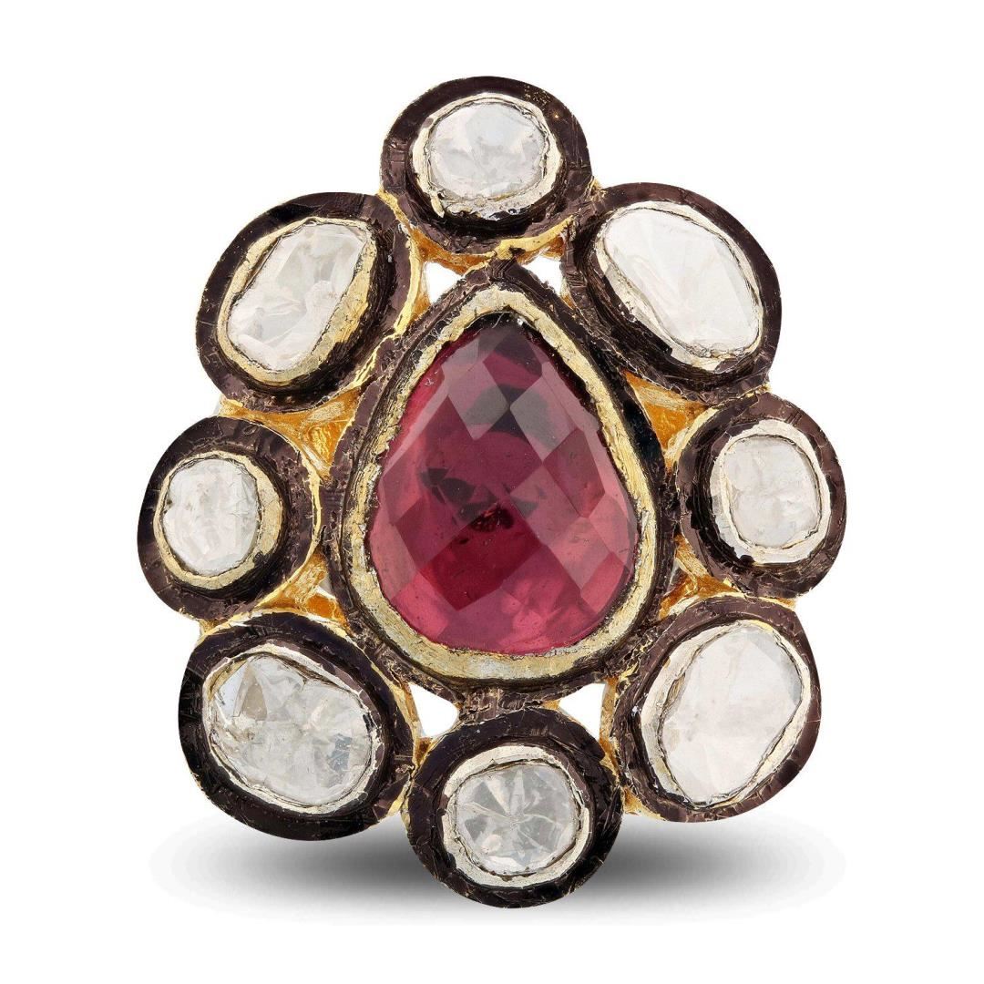 One electronically tested silver and gold ladies custom cast & assembled pink tourmaline and diamond ring. The featured pink tourmaline is set within a diamond floret supported by tapering shoulders, completed by a four millimeter wide band. Bright and an