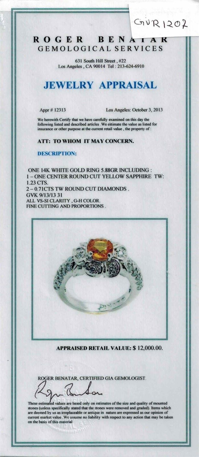 14K WHITE GOLD NATURAL CEYLON YELLOW SAPPHIRE RING:5.88 GRAMS/YELLOW SAPPHIRE:1.23CT/ DIAMOND :0.71CT/#GVR1207 **Warmly crafted in 14kt white gold, this handsome style features a bright yellow 1.23ct Round Cut Sapphire center stone, a gemstone of prospertity and health. Encircled with a fleur motif of shimmering 0.71ct round cut Diamonds, with added detail along its shank, a touch of subtle sparkle brings richness and depth.**