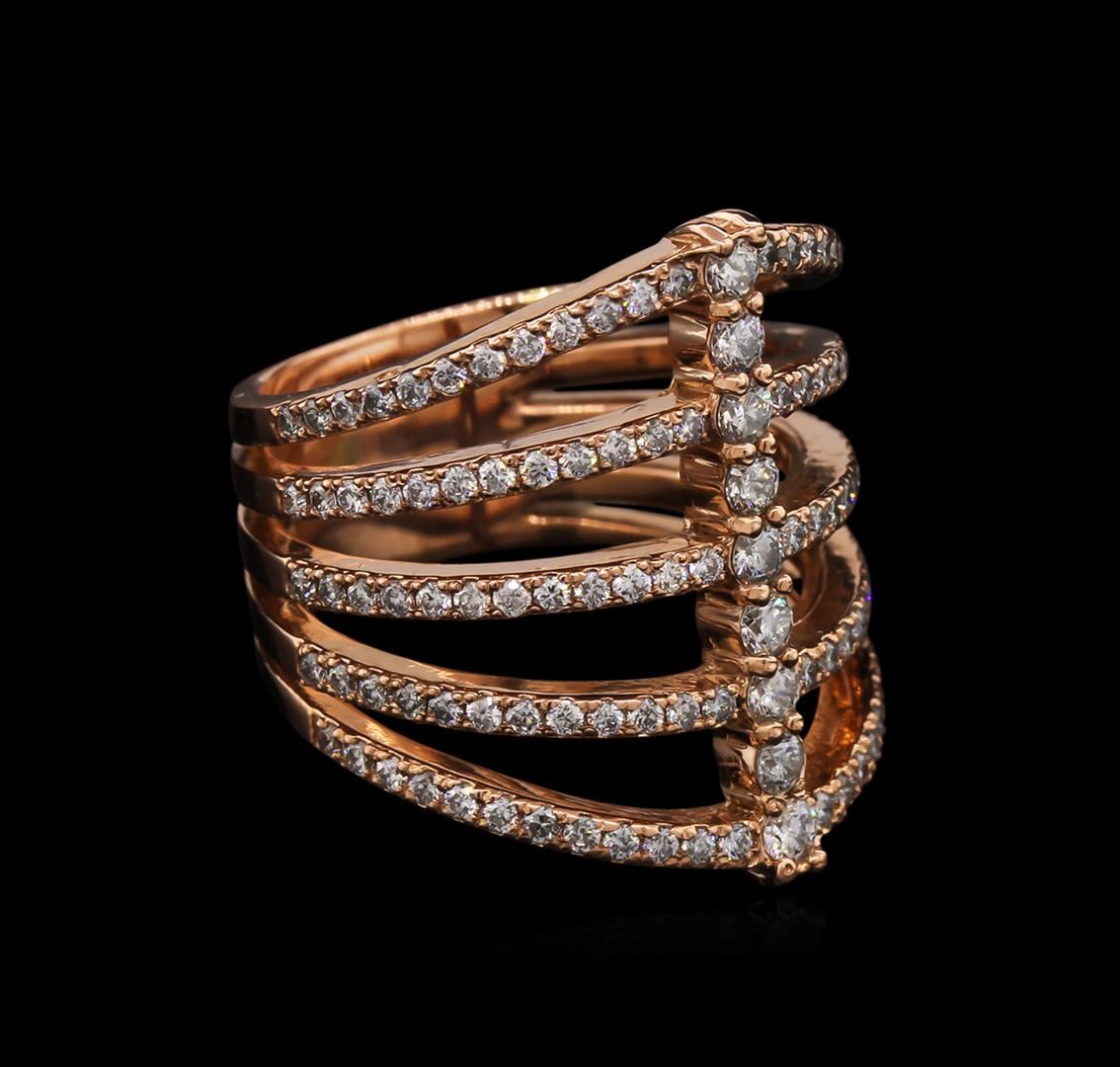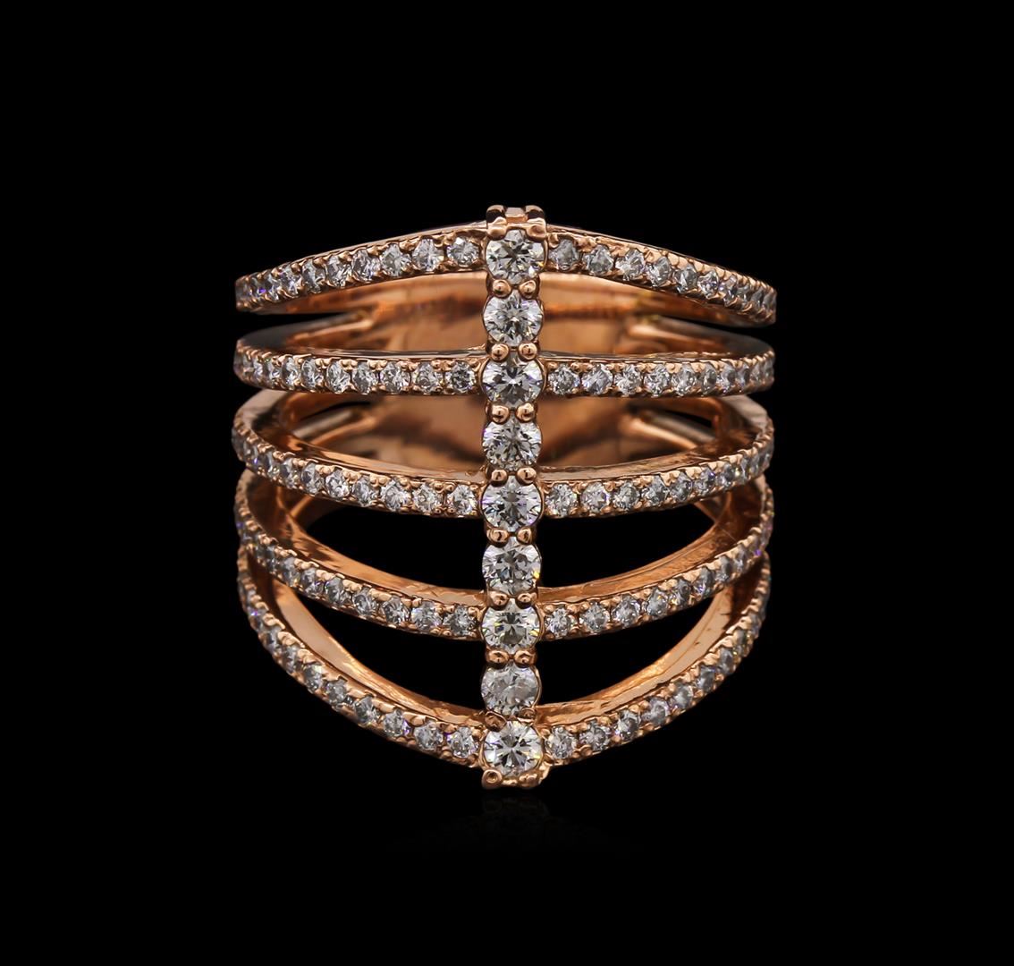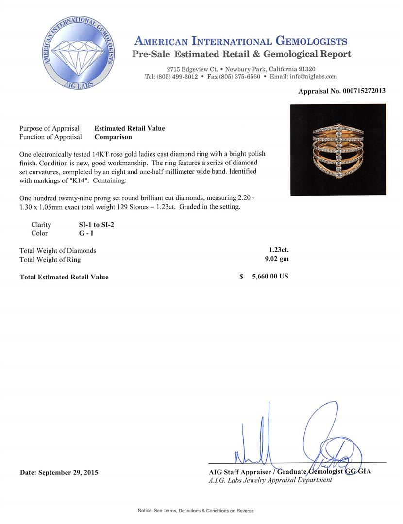 One electronically tested 14KT rose gold ladies cast diamond ring with a bright polish finish. The ring features a series of diamond set curvatures, completed by an eight and one-half millimeter wide band. Identified with markings of "K14". Condition is new, good workmanship. Containing: One Hundred Twenty-Nine prong set round brilliant cut diamonds, measuring 2.20 - 1.30 x 1.05mm exact total weight 129 Stones = 1.23ct. Graded in the setting. Clarity: SI-1 to SI-2. Color: G - I. Total Weight of Diamonds 1.23ct. Total Weight of Ring 9.02gm. AIG Appraised at $5,660.00.