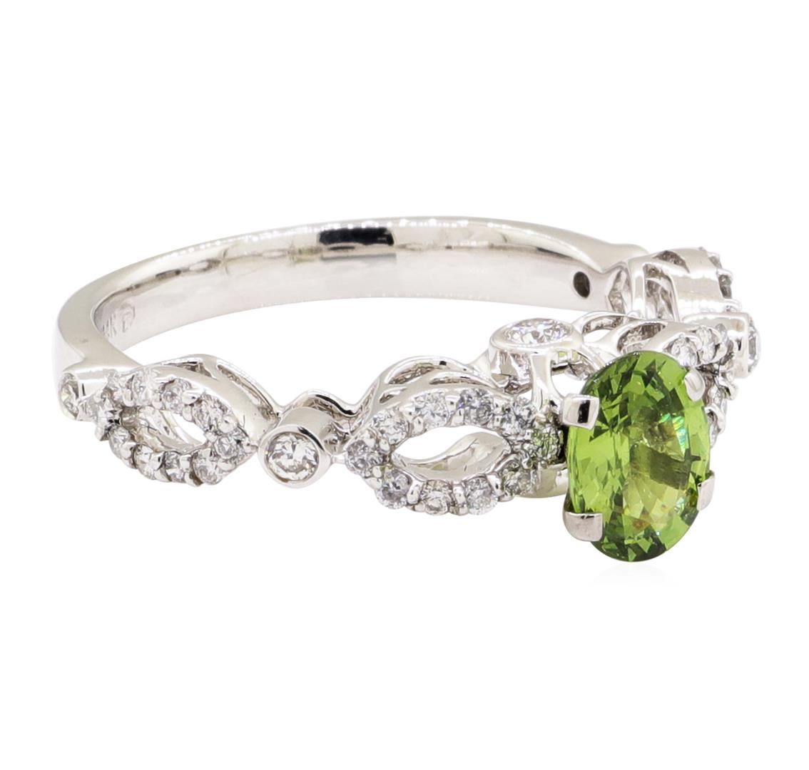 One electronically tested 14KT white gold lady's cast fashion ring with a scalloped split shank with a bright polish finish. The featured lady's ring has a shank measuring 2.60 millimeters wide. Identified with markings of '14K'. Condition is new, good workmanship. Containing: One prong set oval modified mixed cut natural demantoid garnet, measuring 6.95 x 5.16 x 2.60mm, (depth est.) approximate weight of 0.78ct., clarity is eye clean, medium, very slightly grayish, yellowish green color, (GIA yG 5/3), cut is good. Transmitting light with no distortion, transparent. Colored gemstones are presumed to have been subjected to commonly used enhancement processes. Graded in the setting. Two bezel set round brilliant cut diamonds, measuring 2.30 - 2.25 x 1.41mm (depth est.) approximate total weight of 2 Stones = 0.09ct. Graded in the setting. Color H - I Clarity SI-1 to SI-2 Cut Good Four bezel set round brilliant cut diamonds, measuring 2.00 - 1.95 x 1.23mm (depth est.) approximate total weight of 4 Stones = 0.12ct. Graded in the setting. Color H - I Clarity SI-1 to SI-2 Cut Good Forty prong set round brilliant cut diamonds, measuring 1.25 - 1.20 x 0.74mm (depth est.) approximate total weight of 40 Stones = 0.25ct. Graded in the setting. Color G - I Clarity SI-1 to SI-2 Cut Good. Total Weight of Colored Stones 0.78ct.. Total Weight of Diamonds 0.46ct.. Total Weight of Ring 3.30gm GAS Appraised at $3055.00. GAS Appraised at $3,055.00.