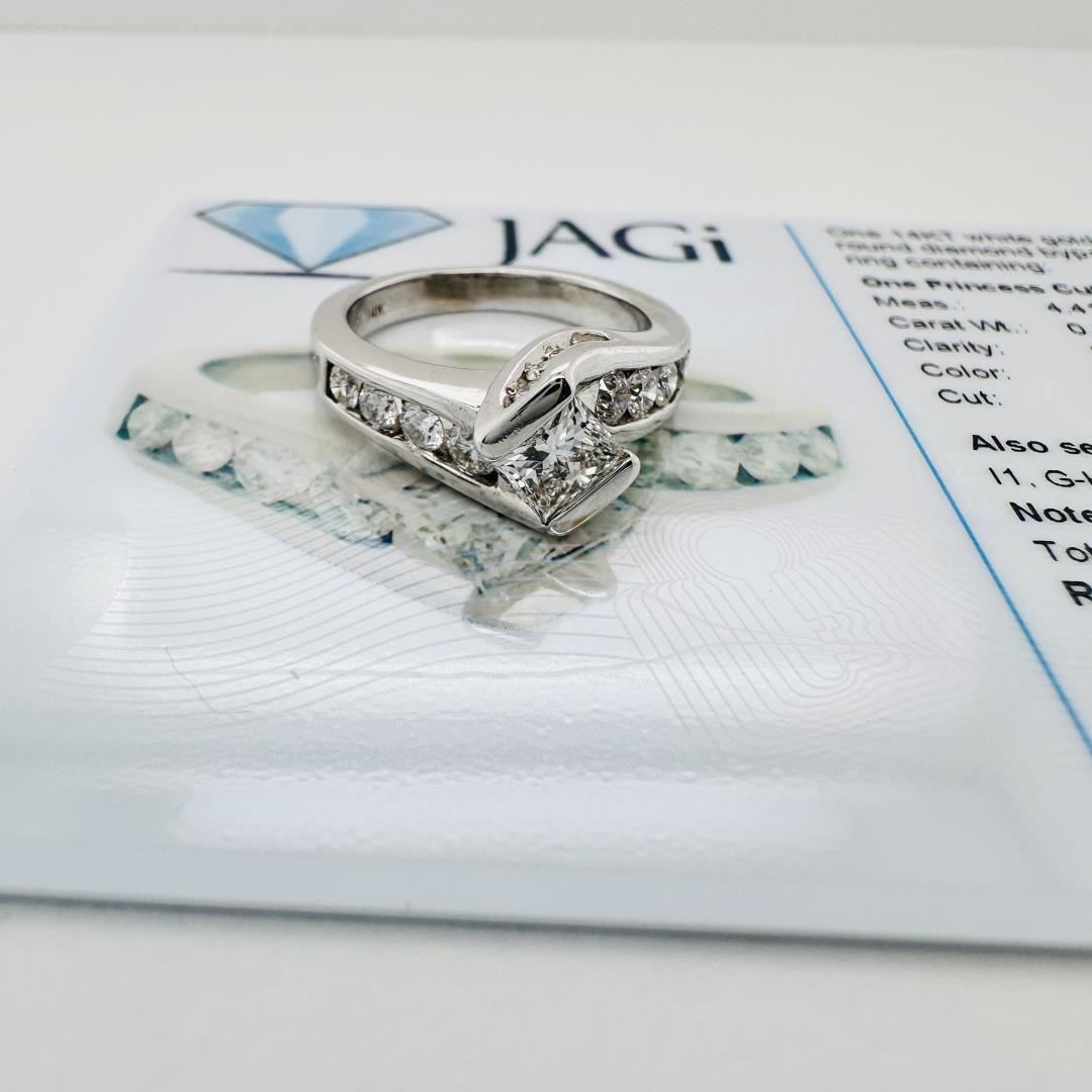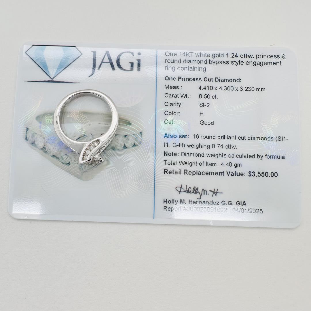 One 14KT white gold engagement ring featuring a bypass design with a princess cut diamond weighing 0.50 carats, measuring approximately 4.41 x 4.30 x 3.23 mm. The diamond is SI-2 clarity, H color, and good cut. Also set are 16 round brilliant cut diamonds (SI1-I1, G-H) totaling approximately 0.74 carats. The ring has a total weight of 4.40 grams. All stone weights are calculated by formula.