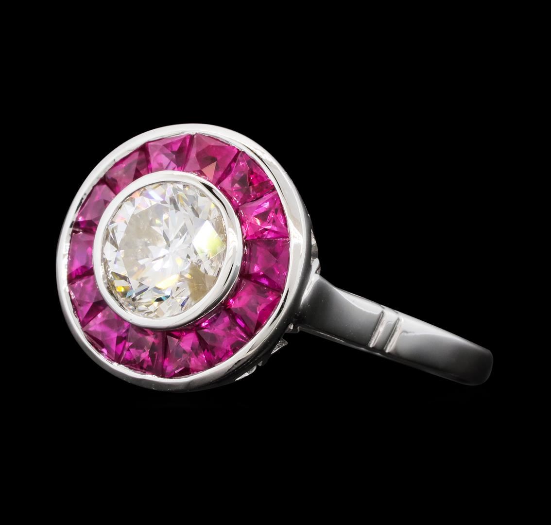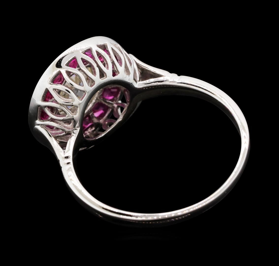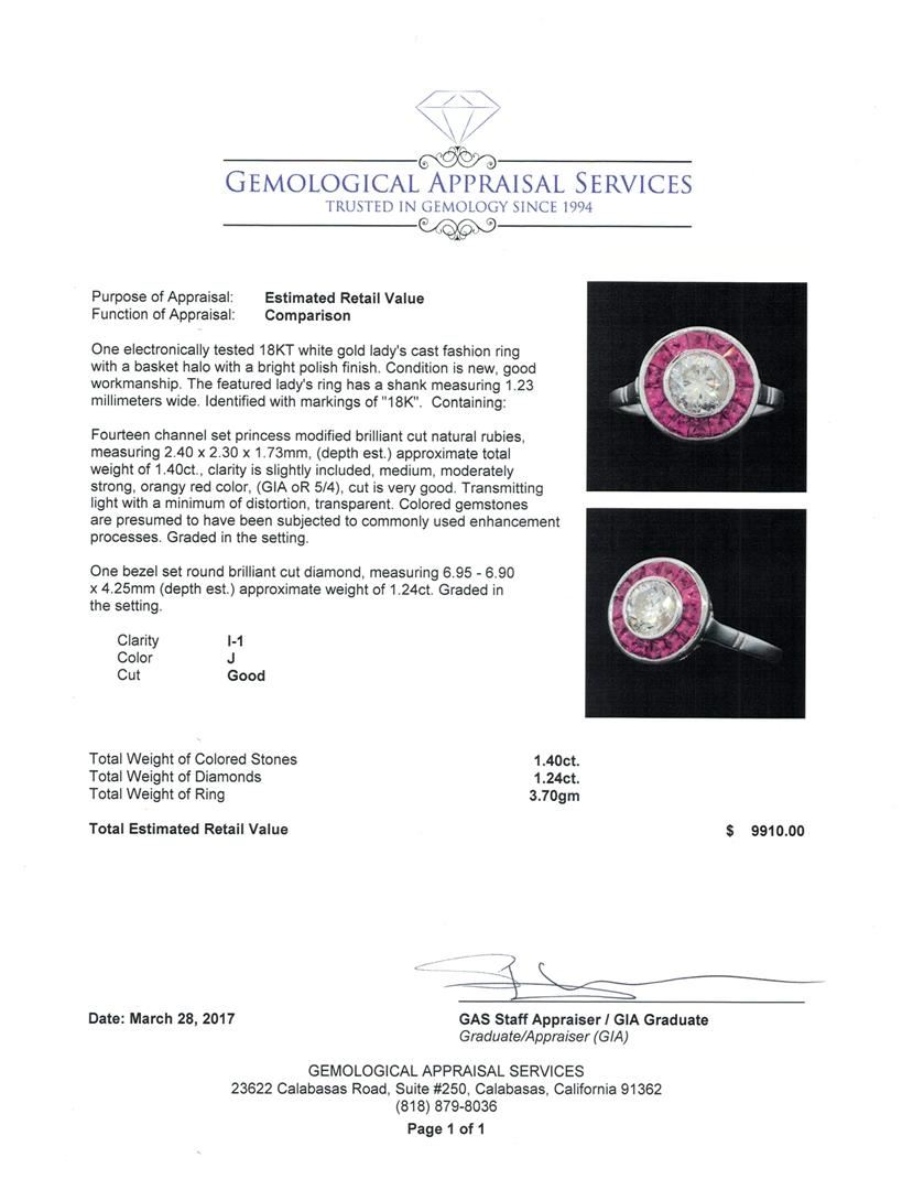 One electronically tested 18KT white gold lady's cast fashion ring with a basket halo with a bright polish finish. The featured lady's ring has a shank measuring 1.23 millimeters wide. Identified with markings of '18K'. Condition is new, good workmanship. GAS Appraised at $9,910.00.