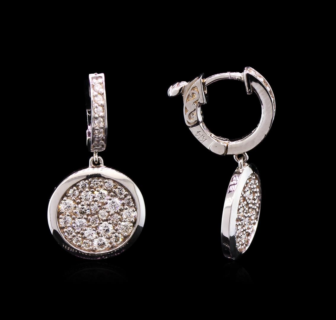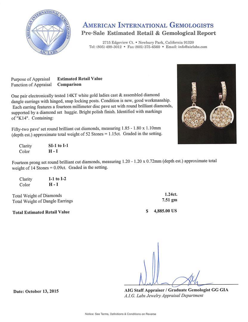 One pair electronically tested 14KT white gold ladies cast & assembled diamond dangle earrings with hinged, snap locking posts. Each earring features a fourteen millimeter disc pave set with round brilliant diamonds, supported by a diamond set huggie. Bright polish finish. Identified with markings of "K14". Condition is new, good workmanship. Containing: Fifty-Two pave' set round brilliant cut diamonds, measuring 1.85 - 1.80 x 1.10mm (depth est.) approximate total weight of 52 Stones = 1.15ct. Graded in the setting. Clarity: SI-1 to I-1. Color: H - I. Fourteen prong set round brilliant cut diamonds, measuring 1.20 - 1.20 x 0.72mm (depth est.) approximate total weight of 14 Stones = 0.09ct. Graded in the setting. Clarity: I-1 to I-2. Color: H - I. Total Weight of Diamonds 1.24ct. Total Weight of Dangle Earrings 7.51gm. AIG Appraised at $4,885.00.