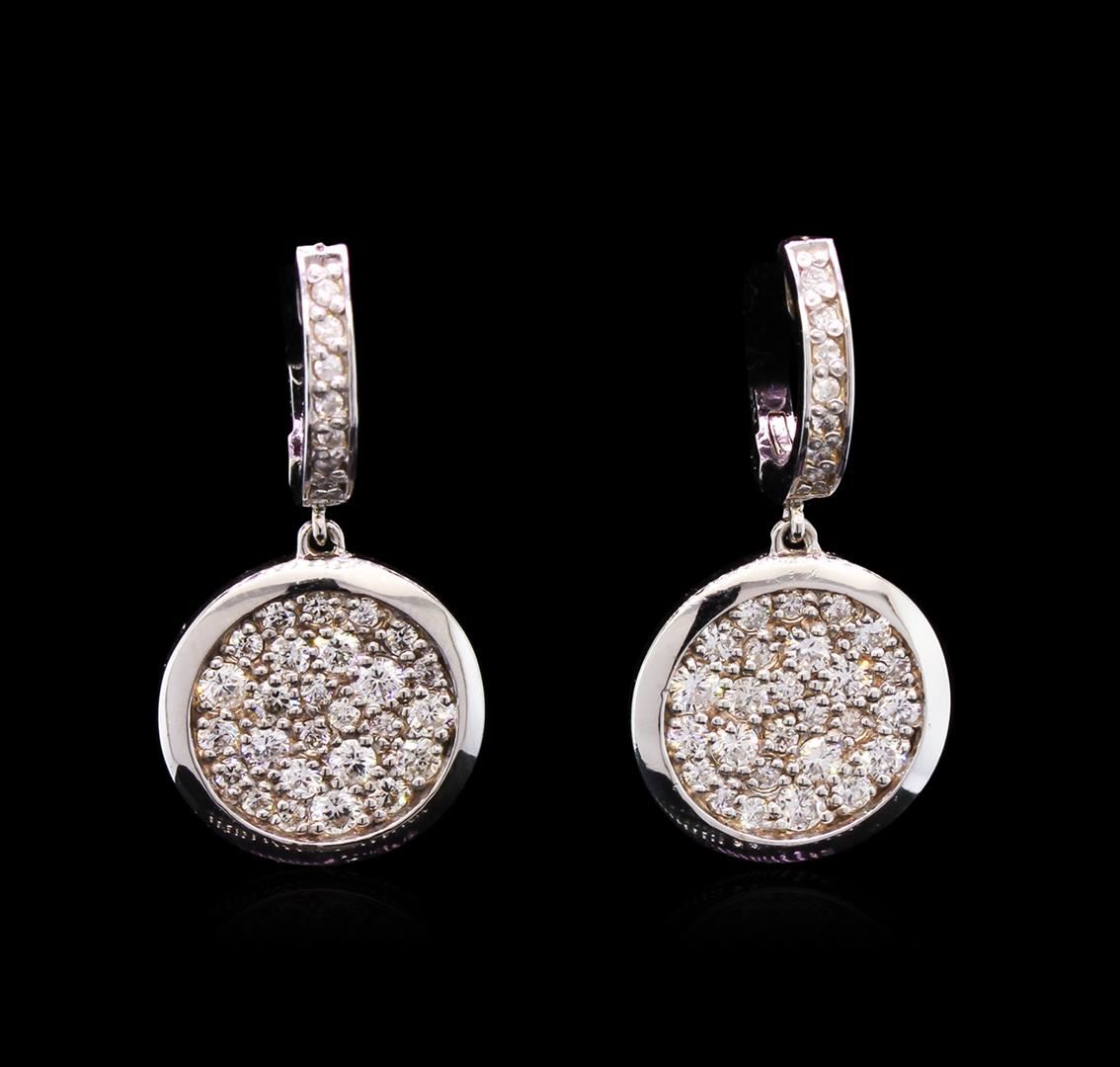 One pair electronically tested 14KT white gold ladies cast & assembled diamond dangle earrings with hinged, snap locking posts. Each earring features a fourteen millimeter disc pave set with round brilliant diamonds, supported by a diamond set huggie. Bright polish finish. Identified with markings of "K14". Condition is new, good workmanship. Containing: Fifty-Two pave' set round brilliant cut diamonds, measuring 1.85 - 1.80 x 1.10mm (depth est.) approximate total weight of 52 Stones = 1.15ct. Graded in the setting. Clarity: SI-1 to I-1. Color: H - I. Fourteen prong set round brilliant cut diamonds, measuring 1.20 - 1.20 x 0.72mm (depth est.) approximate total weight of 14 Stones = 0.09ct. Graded in the setting. Clarity: I-1 to I-2. Color: H - I. Total Weight of Diamonds 1.24ct. Total Weight of Dangle Earrings 7.51gm. AIG Appraised at $4,885.00.