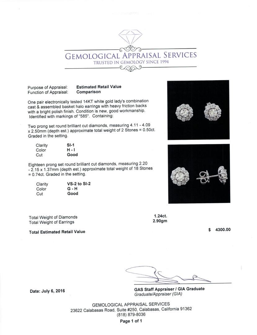 One pair electronically tested 14KT white gold lady's combination cast & assembled basket halo earrings with heavy friction backs with a bright polish finish. Identified with markings of "585". Condition is new, good workmanship. Containing: Two prong set round brilliant cut diamonds, measuring 4.11 - 4.09 x 2.50mm (depth est.) approximate total weight of 2 Stones = 0.50ct. Graded in the setting. Clarity: SI-1. Color: H - I. Cut Good Eighteen prong set round brilliant cut diamonds, measuring 2.20 - 2.15 x 1.37mm (depth est.) approximate total weight of 18 Stones = 0.74ct. Graded in the setting. Clarity: VS-2 to SI-2. Color: G - H. Cut Good. Total Weight of Diamonds 1.24ct. Total Weight of Earrings 2.90gm. GAS Appraised.