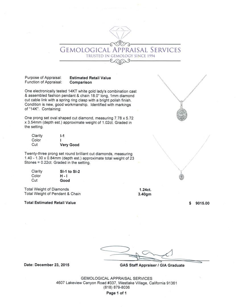 One electronically tested 14KT white gold lady's combination cast & assembled fashion pendant & chain 18.0" long, 1mm diamond cut cable link with a spring ring clasp with a bright polish finish. Identified with markings of "14K". Condition is new, good workmanship. Containing: One prong set oval shaped cut diamond, measuring 7.78 x 5.72 x 3.54mm (depth est.) approximate weight of 1.02ct. Graded in the setting. Clarity: I-1. Color: I. Cut Very Good Twenty-Three prong set round brilliant cut diamonds, measuring 1.40 - 1.30 x 0.84mm (depth est.) approximate total weight of 23 Stones = 0.22ct. Graded in the setting. Clarity: SI-1 to SI-2. Color: H - I. Cut Good. Total Weight of Diamonds 1.24ct. Total Weight of Pendant & Chain 3.40gm. GAS Appraised at $9,015.00.