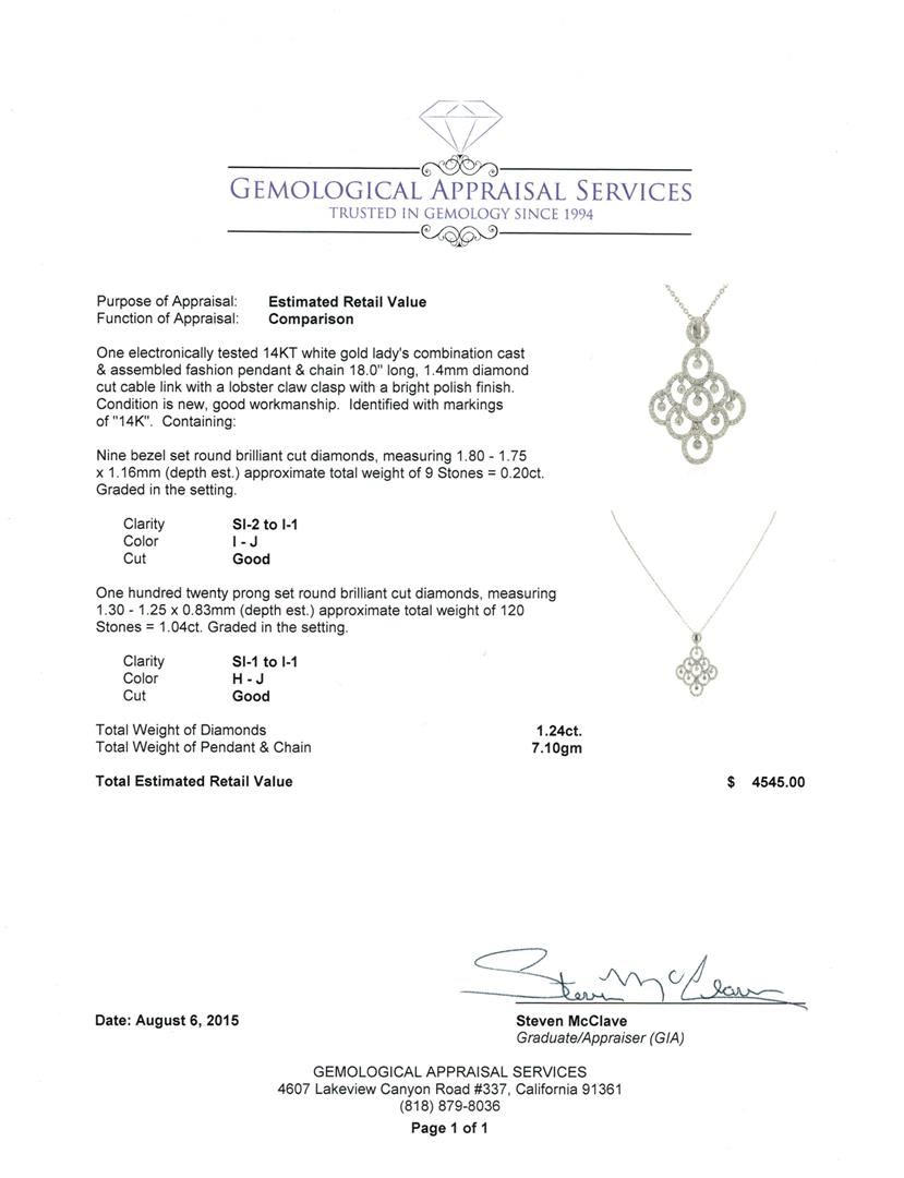 One electronically tested 14KT white gold lady's combination cast & assembled fashion pendant & chain 18.0" long, 1.4mm diamond cut cable link with a lobster claw clasp with a bright polish finish. Identified with markings of "14K". Condition is new, good workmanship. Containing: Nine bezel set round brilliant cut diamonds, measuring 1.80 - 1.75 x 1.16mm (depth est.) approximate. Total Weight of 9 Stones = 0.20ct. Graded in the setting. Clarity: SI-2 to I-1. Color: I - Good One Hundred Twenty prong set round brilliant cut diamonds, measuring 1.30 - 1.25 x 0.83mm (depth est.) approximate. Total Weight of 120 Stones = 1.04ct. Graded in the setting. Clarity: SI-1 to I-1. Color: H - Good. Total Weight of Diamonds 1.24ct. Total Weight of Pendant & Chain 7.10gm. GAS Appraised at $4,545.00.