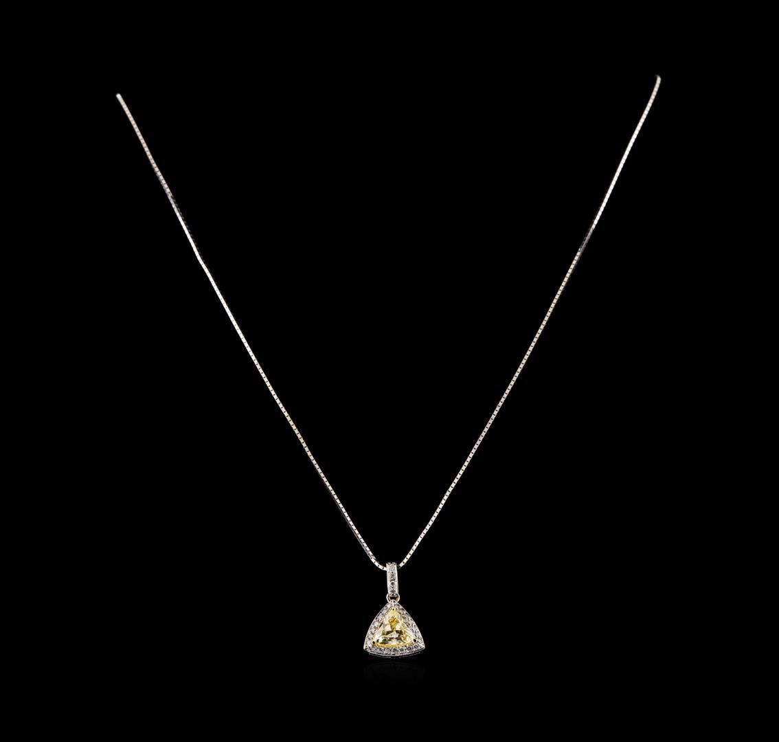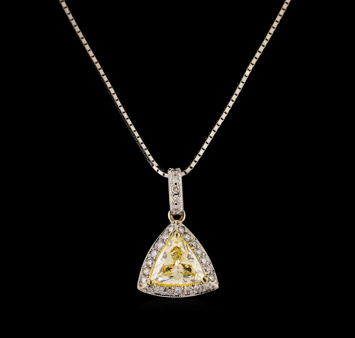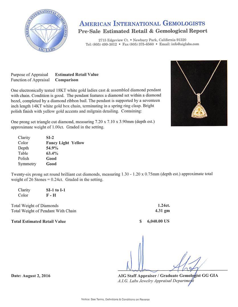 One electronically tested 18KT white gold ladies cast & assembled diamond pendant with chain. The pendant features a diamond set within a diamond bezel, completed by a diamond ribbon bail. The pendant is supported by a seventeen inch length 14KT white gold box chain, terminating in a spring ring clasp. Bright polish finish with yellow gold accents and milgrain detailing. Condition is good. Containing: One prong set triangle cut diamond, measuring 7.20 x 7.10 x 3.90mm (depth est.) approximate weight of 1.00ct. Graded in the setting. Clarity SI-2. Depth: 54.9%. Table: 63.4%. Twenty-Six prong set round brilliant cut diamonds, measuring 1.30 - 1.20 x 0.75mm (depth est.) approximate total weight of 26 Stones = 0.24ct. Graded in the setting. Clarity SI-1 to I-1. Color: F - H. Total Weight of Diamonds 1.24ct.. Total Weight of Pendant With Chain 4.31gm. AIG Appraised at $6,040.00.