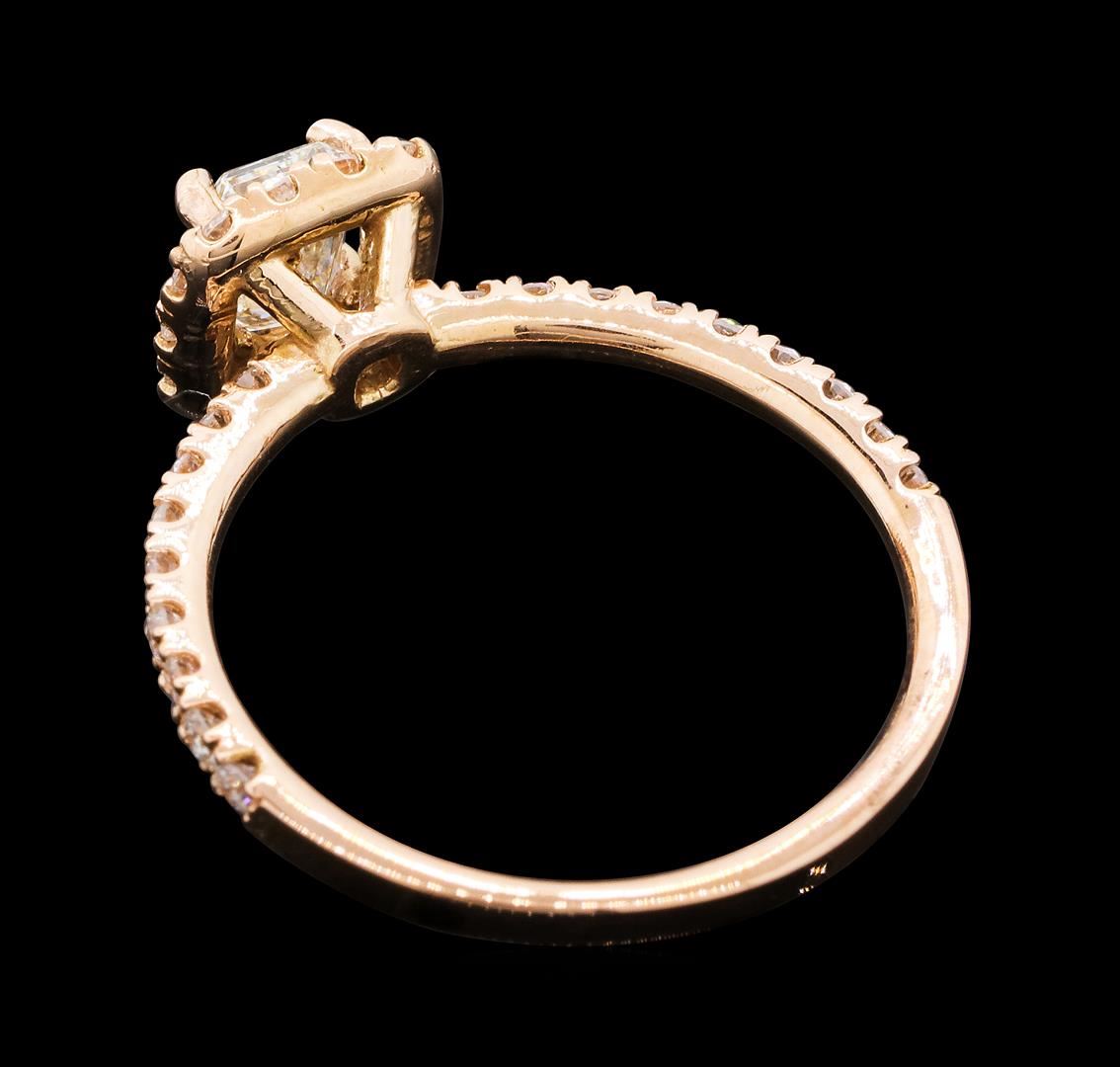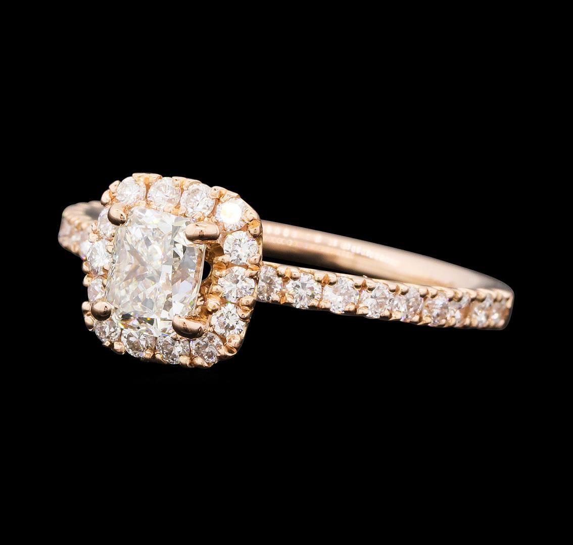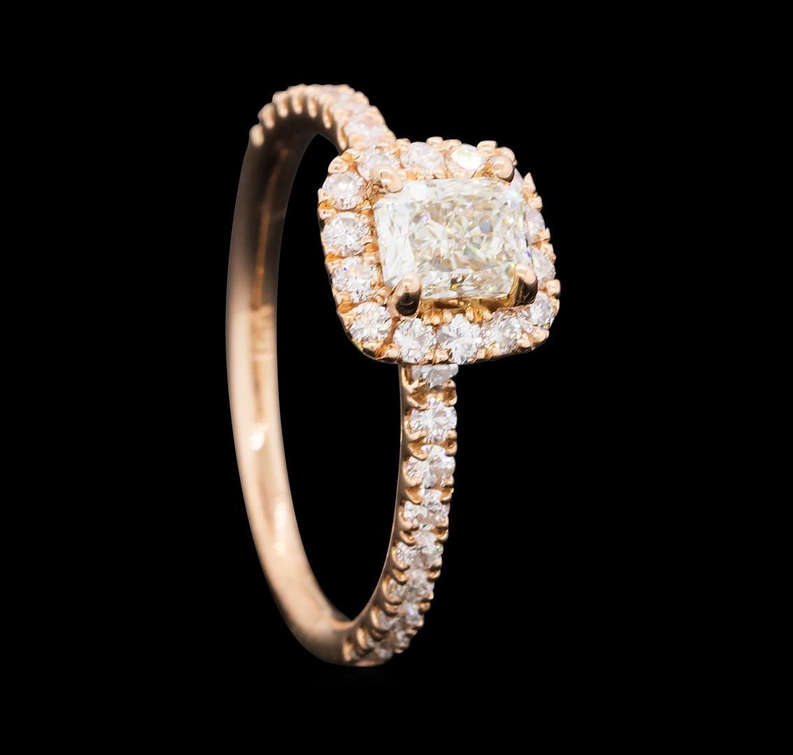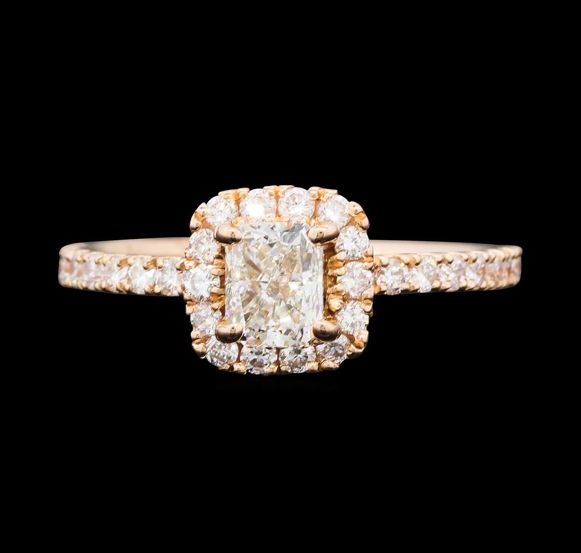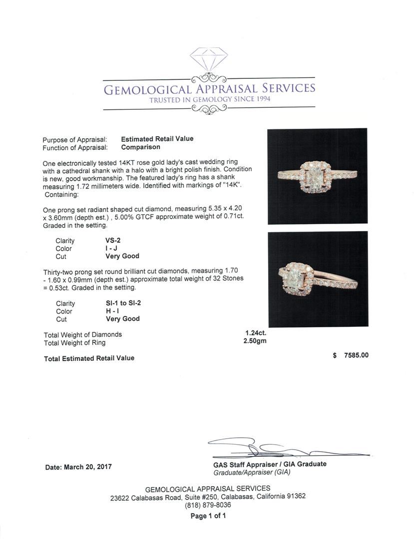 One electronically tested 14KT rose gold lady's cast wedding ring with a cathedral shank with a halo with a bright polish finish. The featured lady's ring has a shank measuring 1.72 millimeters wide. Identified with markings of '14K'. Condition is new, good workmanship. Containing: One prong set radiant shaped cut diamond, measuring 5.35 x 4.20 x 3.60mm (depth est.) , 5.00.%. GTCF approximate weight of 0.71ct. Graded in the setting. Color I - J Clarity VS-2 Cut Very Good Thirty-Two prong set round brilliant cut diamonds, measuring 1.70 - 1.60 x 0.99mm (depth est.) approximate total weight of 32 Stones = 0.53ct. Graded in the setting. Color H - I Clarity SI-1 to SI-2 Cut Very Good. Total Weight of Diamonds 1.24ct.. Total Weight of Ring 2.50gm GAS Appraised at $7,585.00.